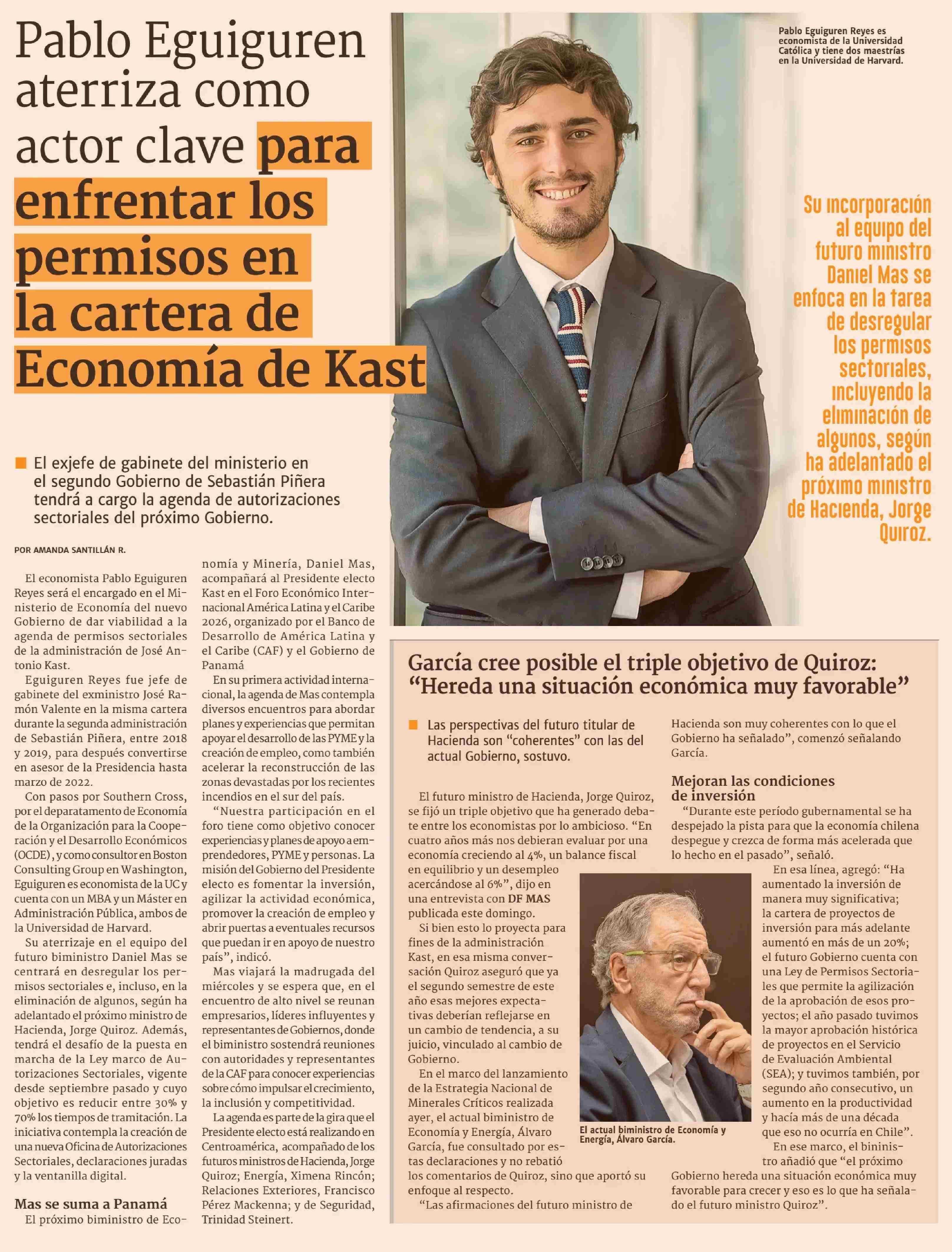 Pablo Eguiguren aterriza como actor clave para enfrentar los permisos en la cartera de Economía de Kast 28-01-2026 Diario Financiero |