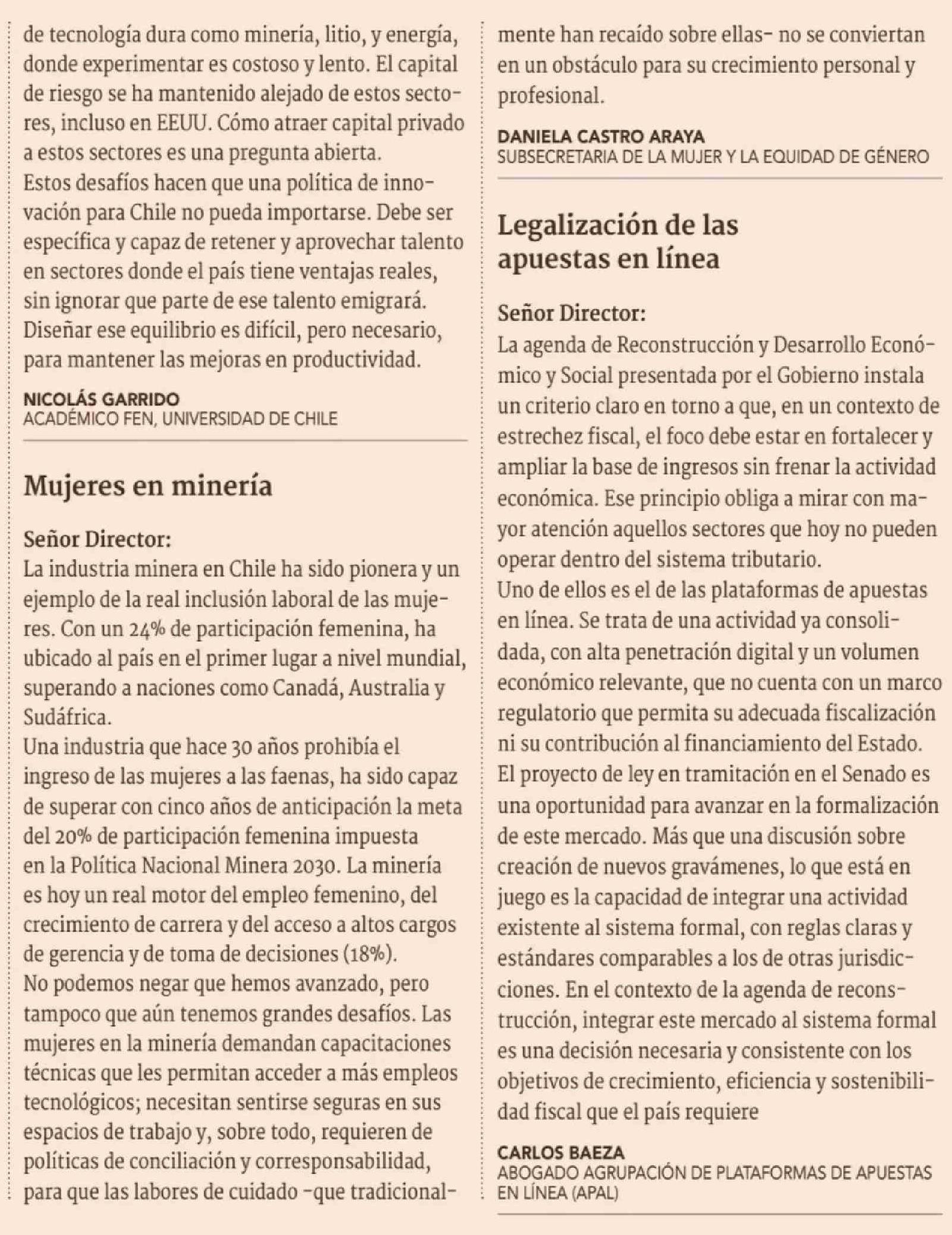 Cartas: Mujeres en minería 21-04-2026 Diario Financiero |
