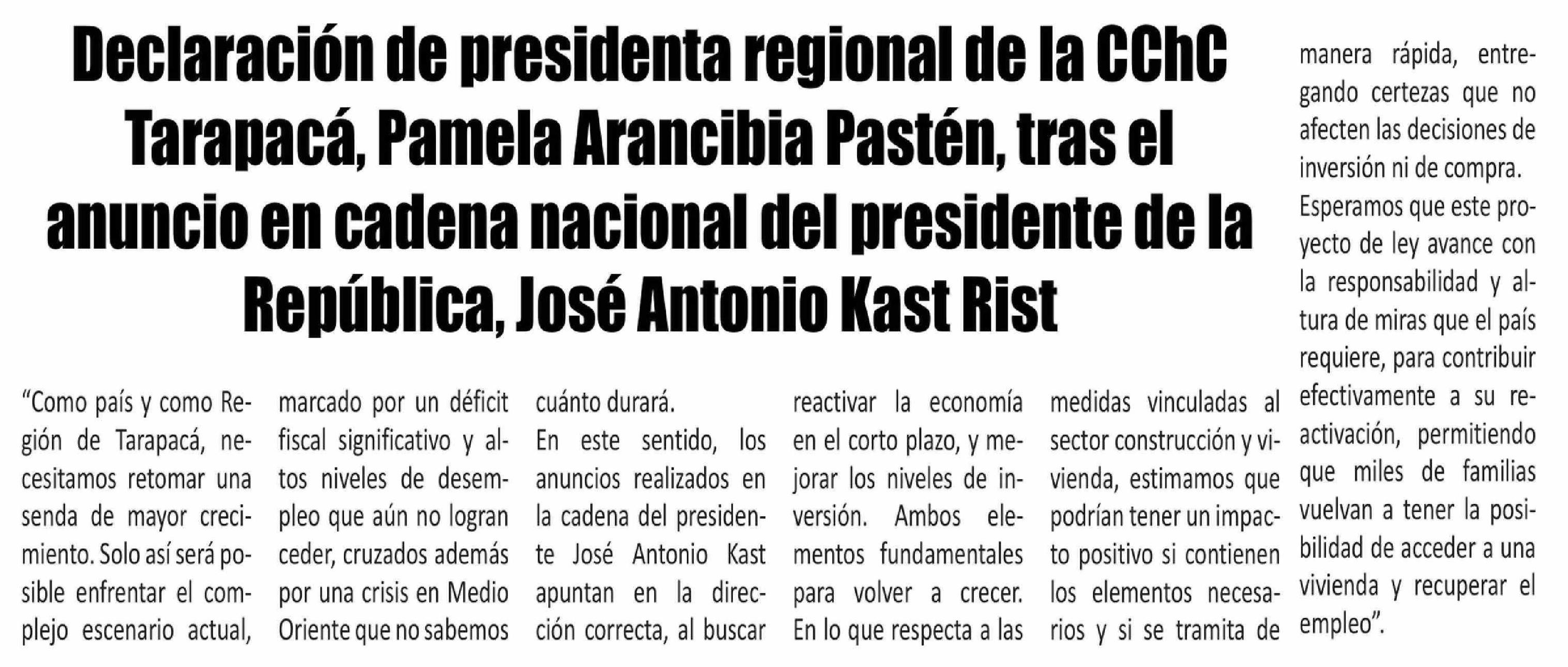 | Título: | Declaración de presidenta regional de la CChC Tarapacá, Pamela Arancibia Pastén, tras el anuncio en cadena nacional del presidente de la República, José Antonio Kast Rist |
