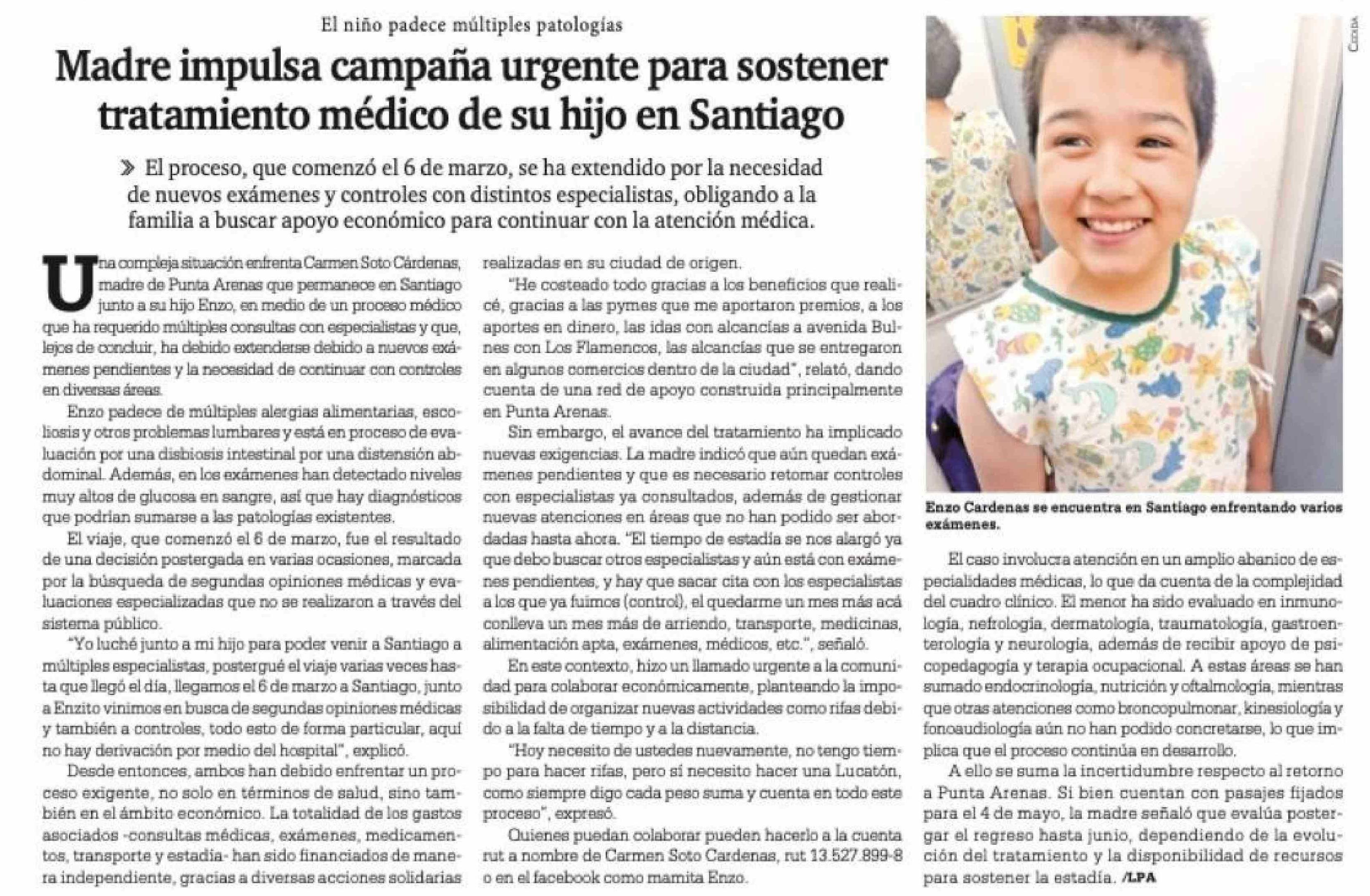Madre impulsa campaña urgente para sostener tratamiento médico de su hijo en Santiago 18-04-2026 La Prensa Austral |