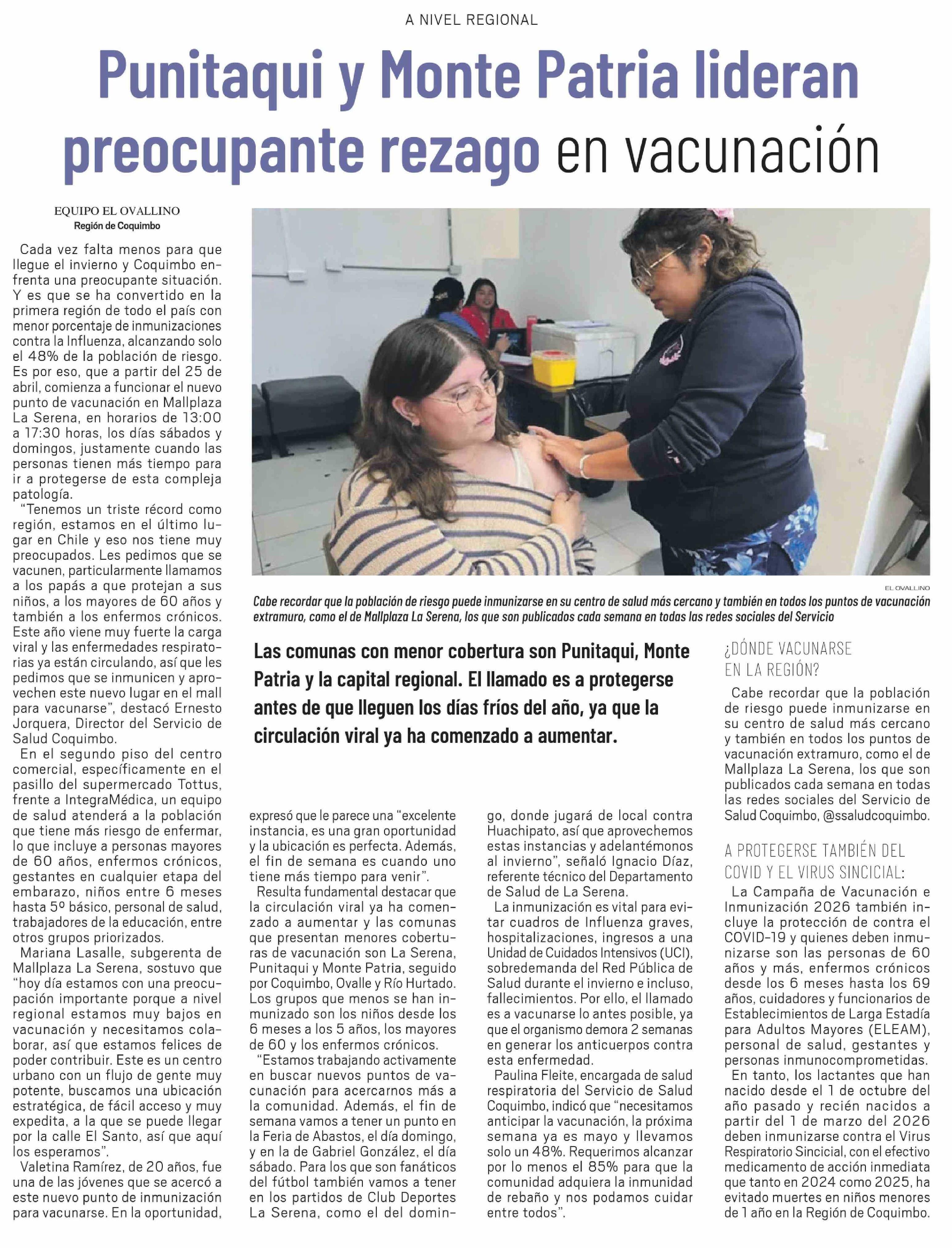 Punitaqui y Monte Patria lideran preocupante rezago en vacunación 26-04-2026 El Ovallino |
