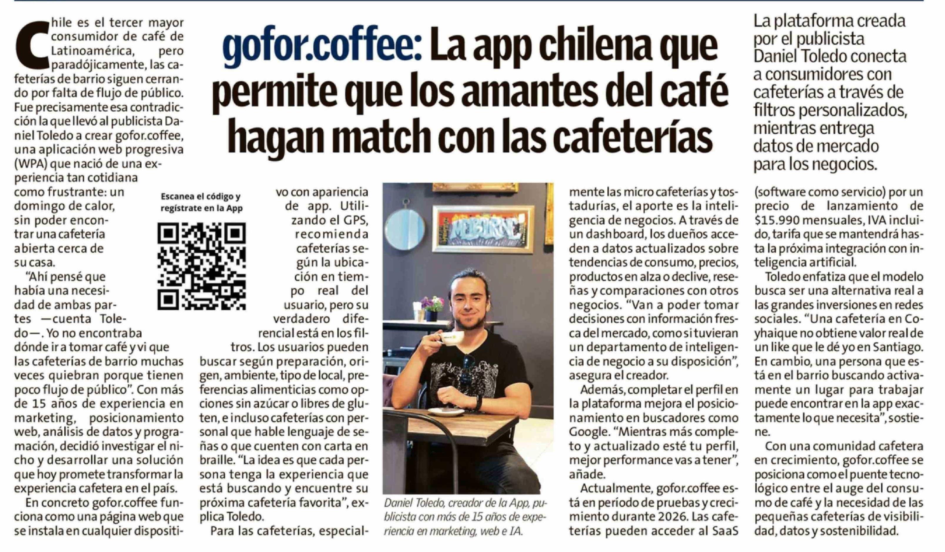 Gofor.coffee: La app chilena que permite que los amantes del café hagan match con las cafeterías 23-03-2026 El Austral de la Araucanía |