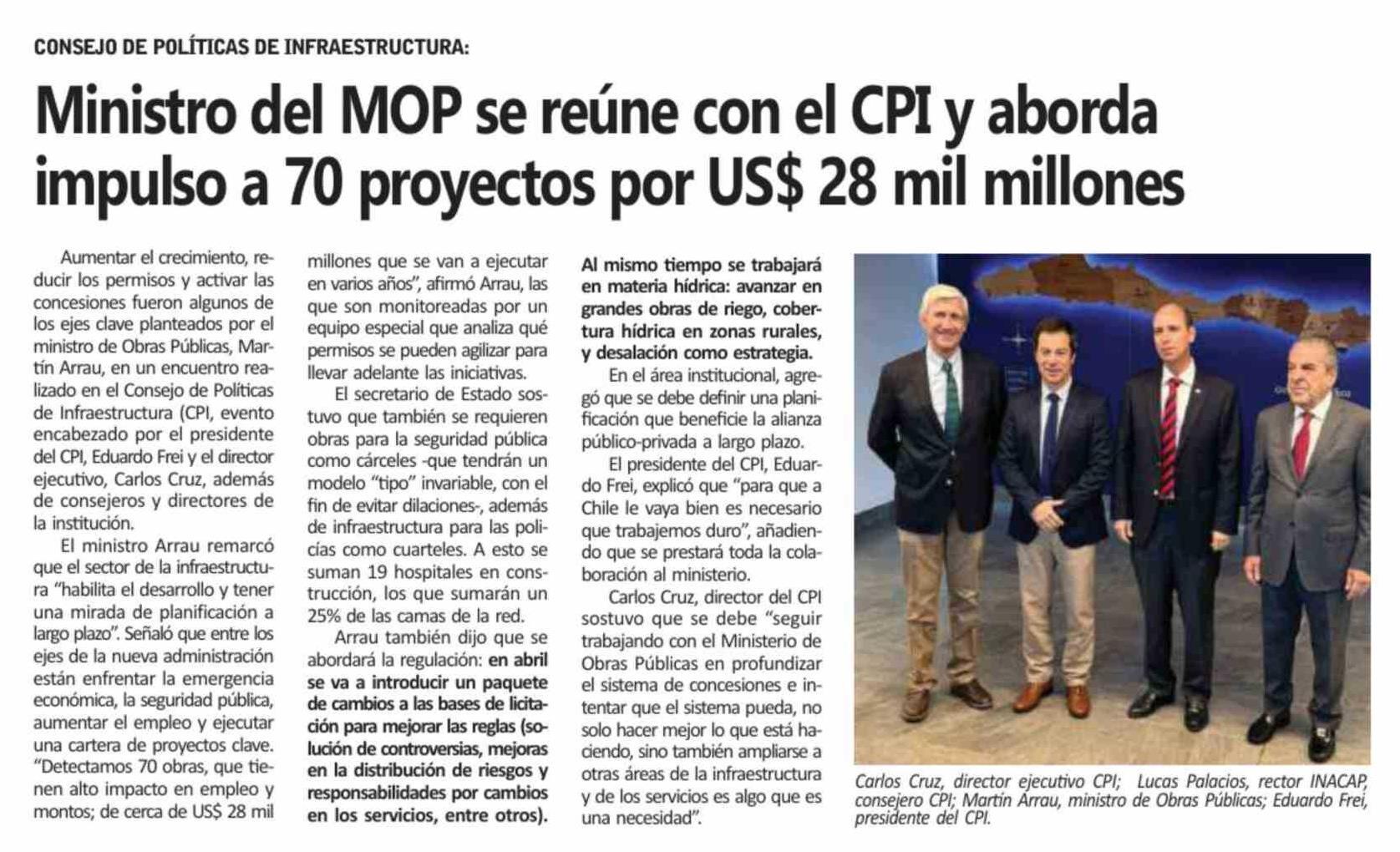 | Título: | Ministro del MOP se reúne con el CPI y aborda impulso a 70 proyectos por US$ 28 mil millones |