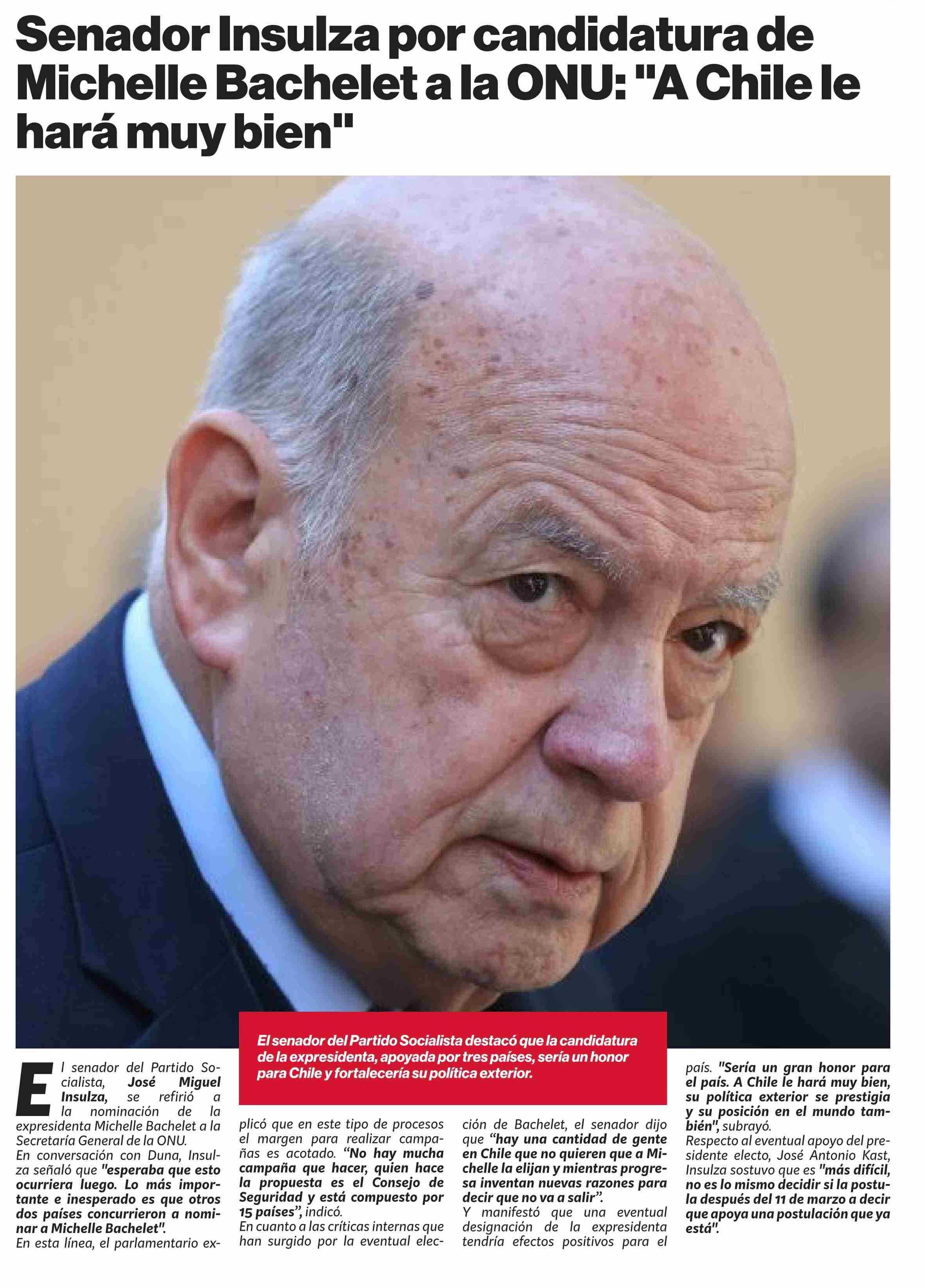 Título: Senador Insulza por candidatura de Michelle Bachelet a la ONU: “A Chile le hará muy bien”