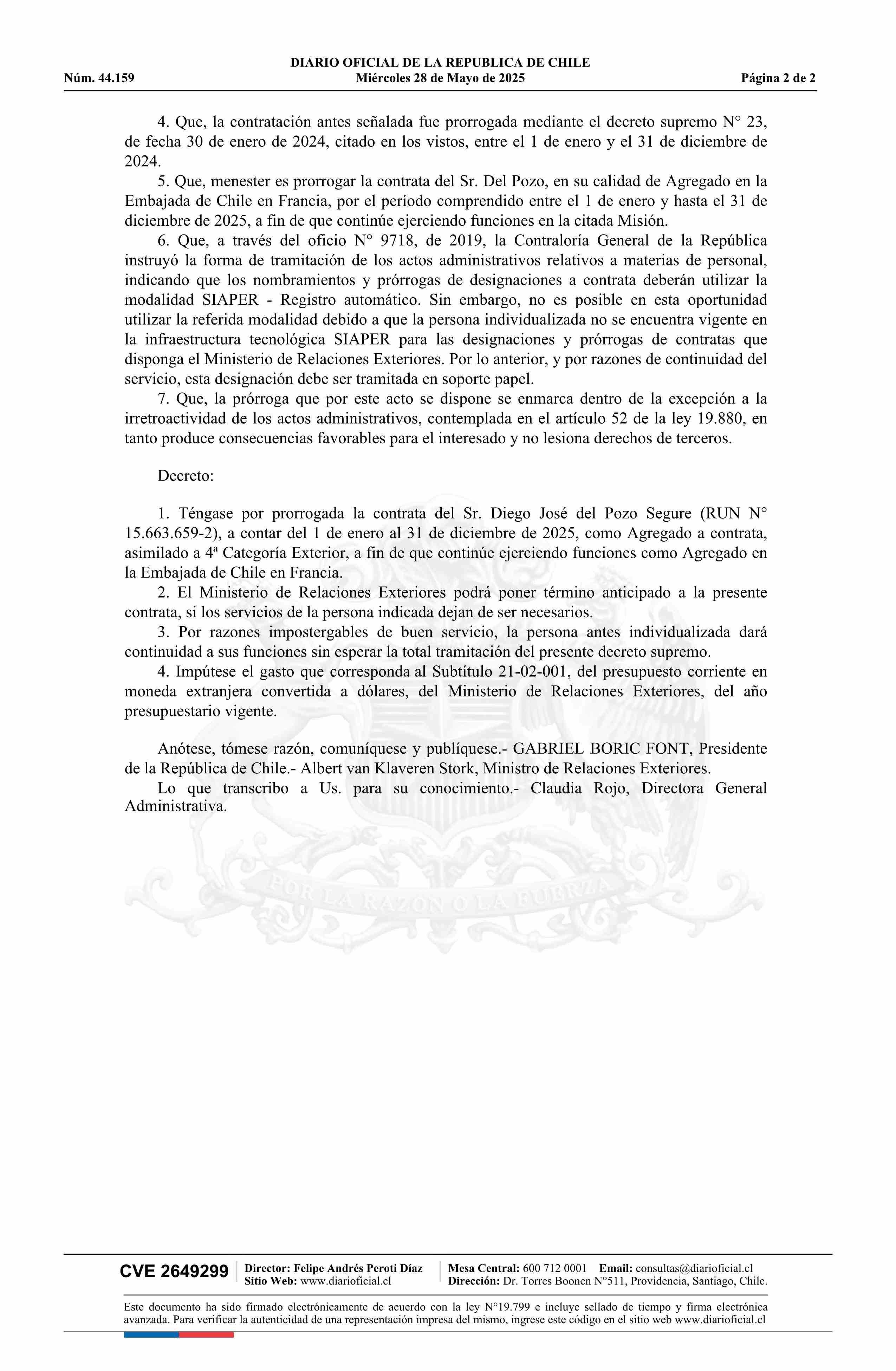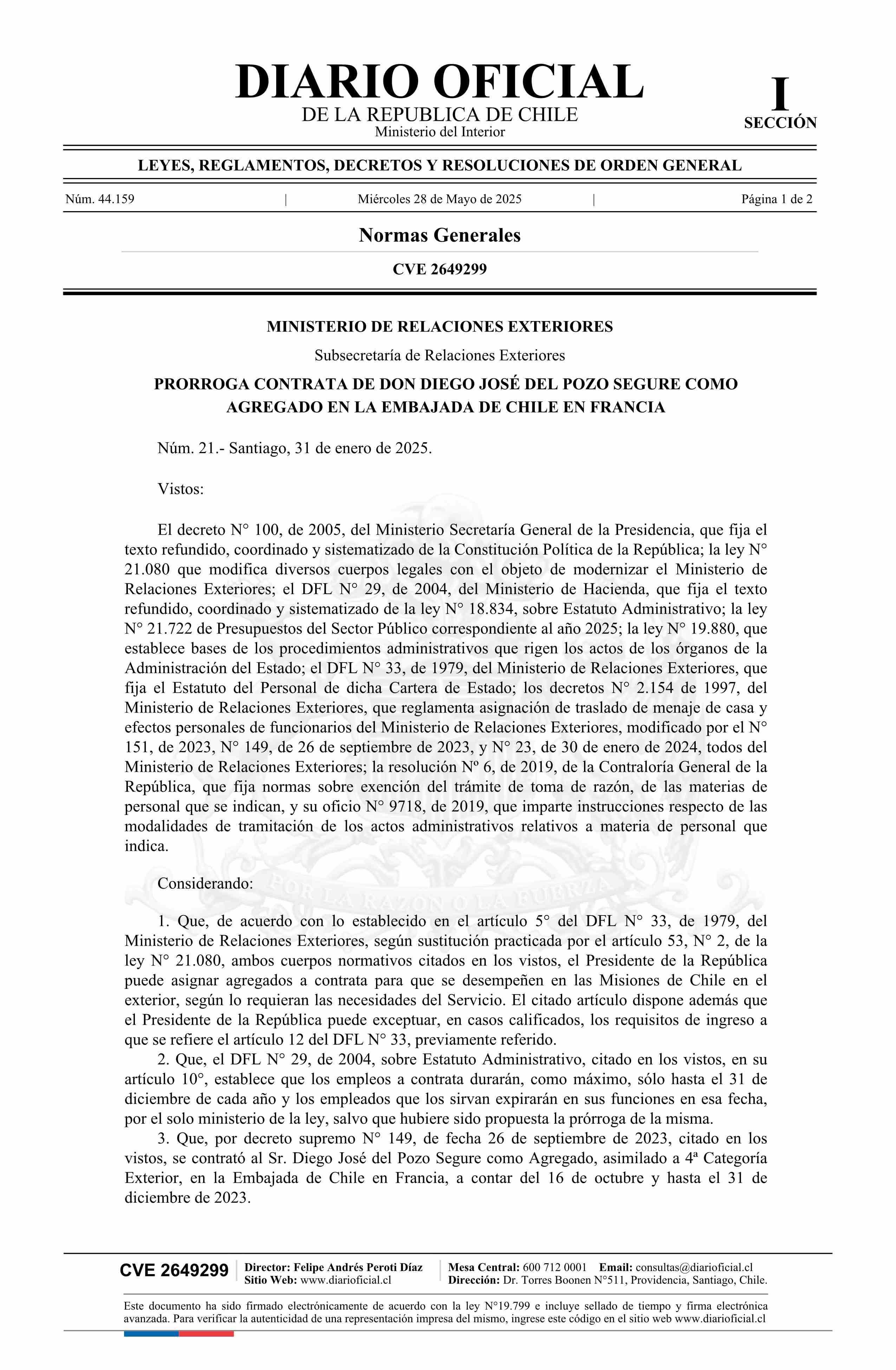 Decreto número 21, de 2025.- Prorroga contrata de don Diego José del Pozo Segure como Agregado en la Embajada de Chile en Francia 28-05-2025 DIARIO OFICIAL CHILE - BOLETÍN OFICIAL DE MINERÍA |