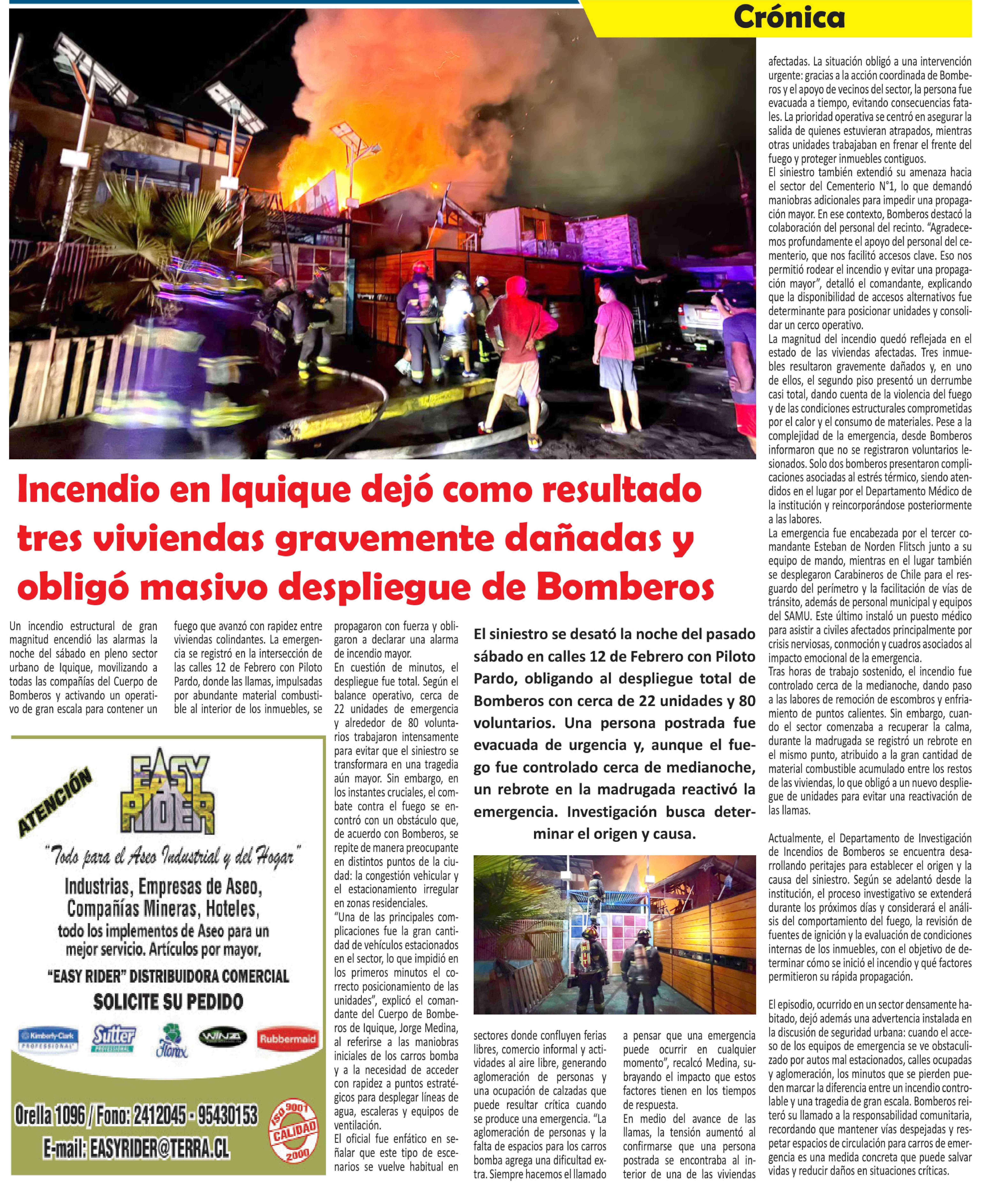 Título: Incendio en Iquique dejó como resultado tres viviendas gravemente dañadas y obligó masivo despliegue de Bomberos