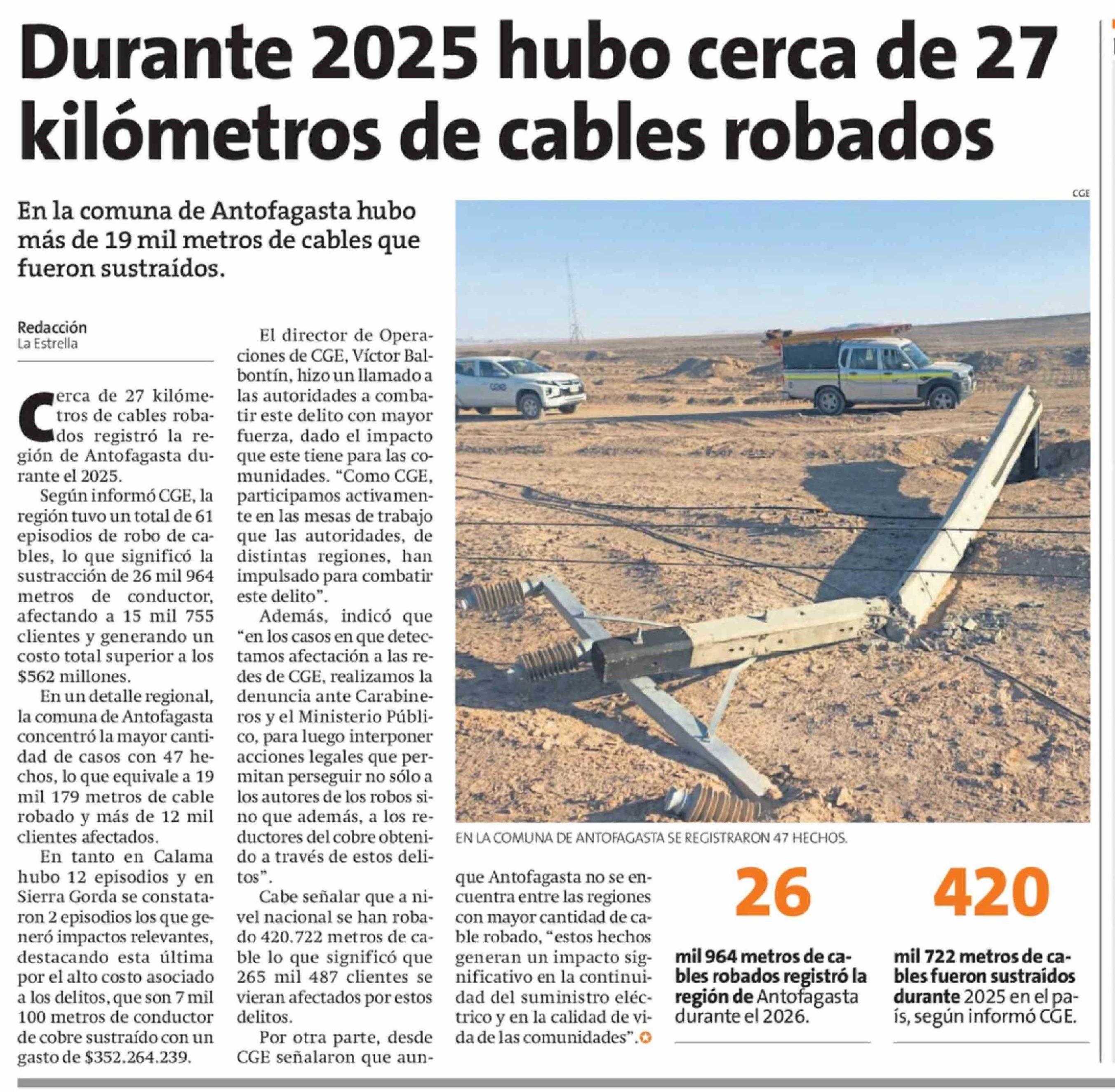 Durante 2025 hubo cerca de 27 kilómetros de cables robados 05-02-2026 La Estrella de Antofagasta |