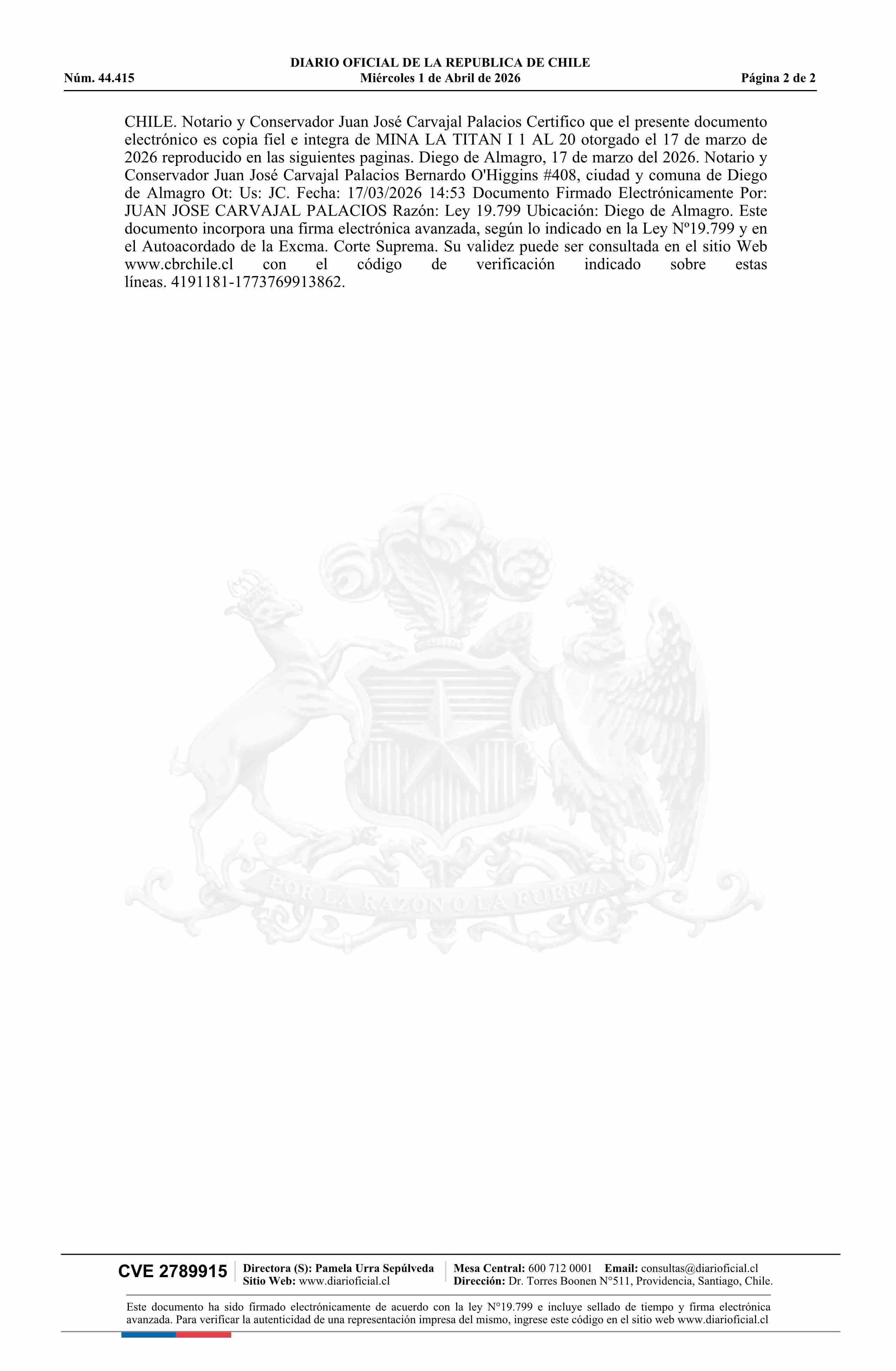 MINA LA TITAN I 1 AL 20 / Gallardo y Soto Minería e Inversiones Limitada 01-04-2026 DIARIO OFICIAL CHILE - BOLETÍN OFICIAL DE MINERÍA |