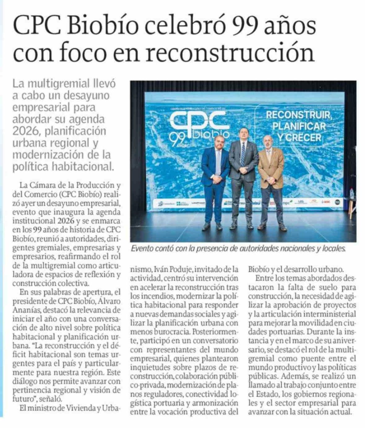 Título: CPC Biobío celebró 99 años con foco en reconstrucción