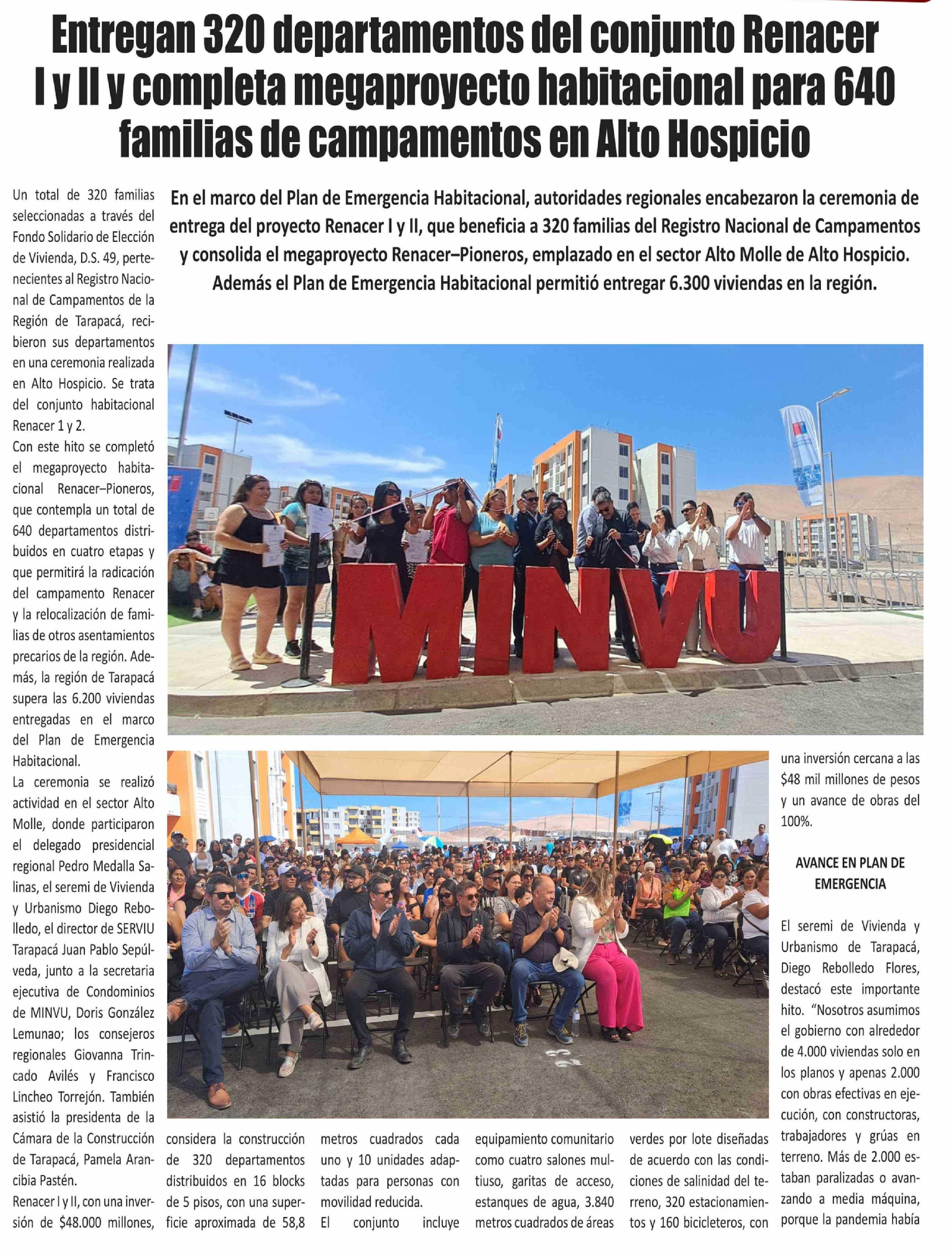 Título: Entregan 320 departamentos del conjunto Renacer I y II y completa megaproyecto habitacional para 640 familias de campamentos en Alto Hospicio