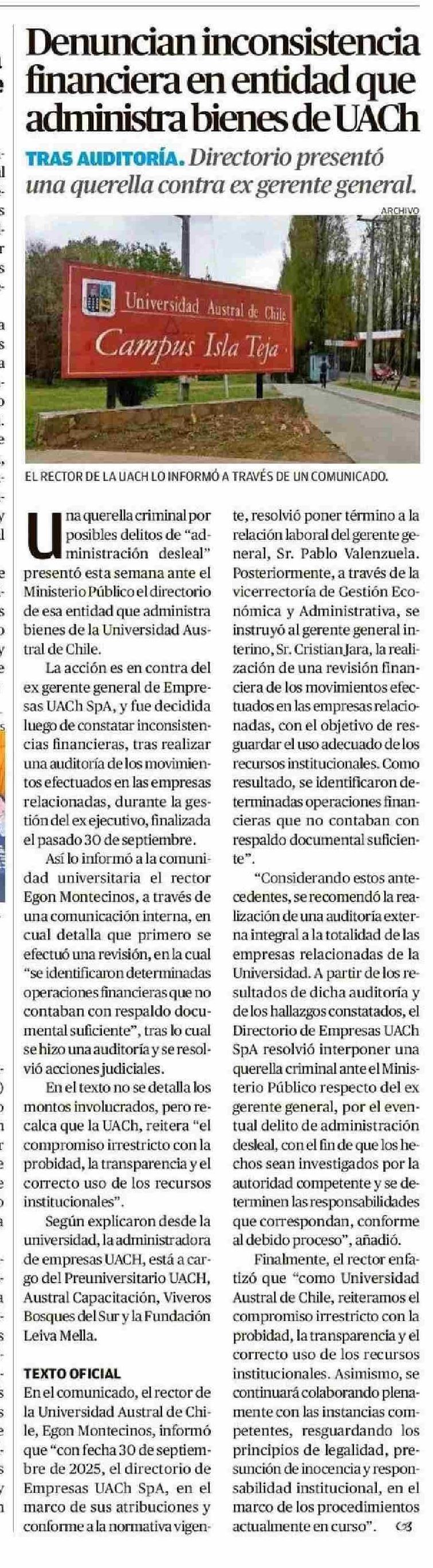 Denuncian inconsistencia financiera en entidad que administra bienes de UACh 16-01-2026 Diario Austral Región de Los Ríos |