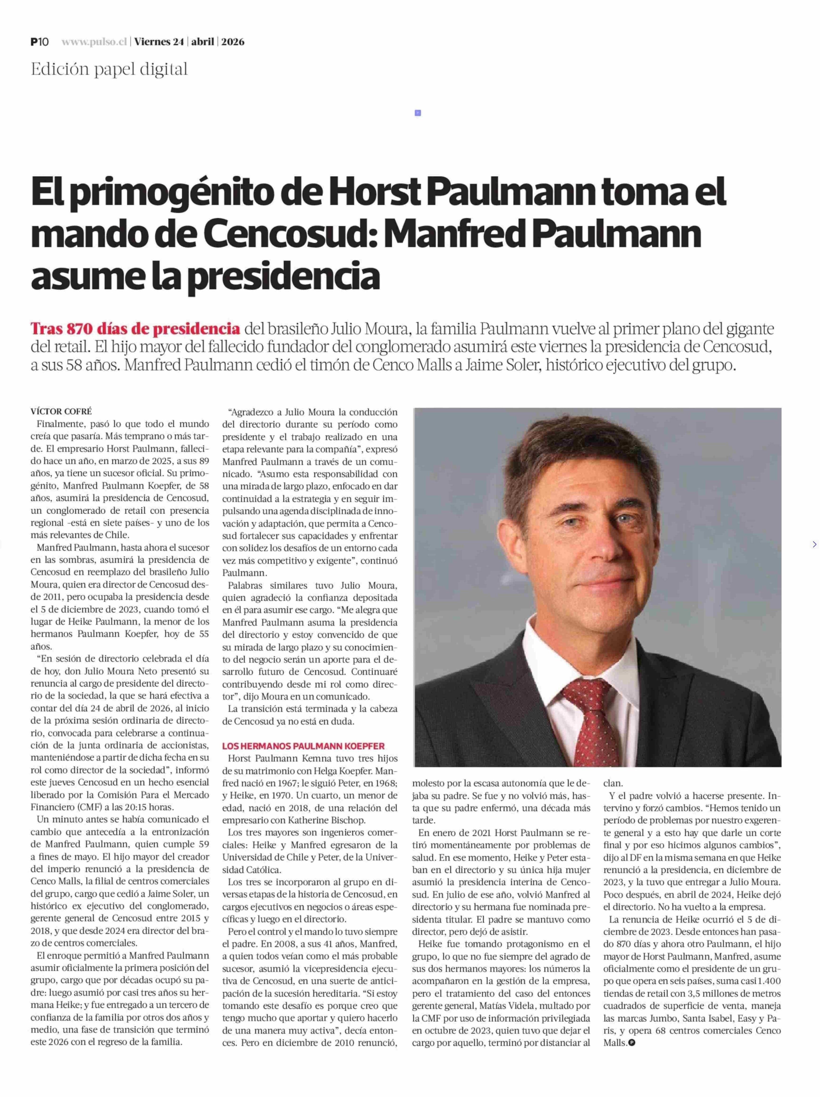 Título: El primogénito de Horst Paulmann toma el mando de Cencosud: Manfred Paulmann asume la presidencia