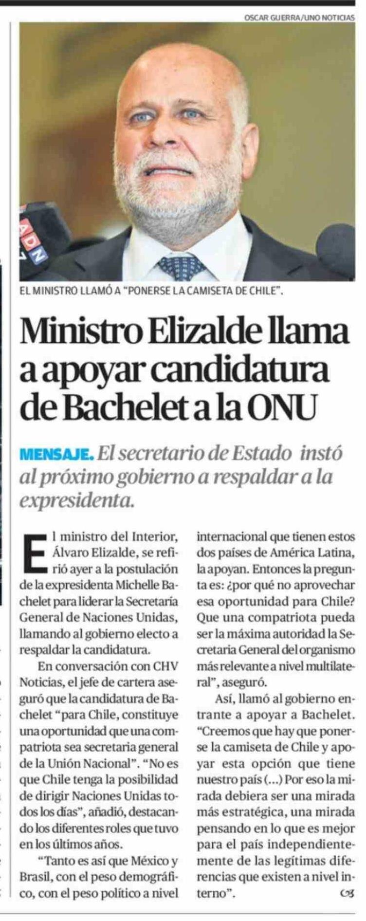 | Título: | Ministro Elizalde llama a apoyar candidatura de Bachelet a la ONU |