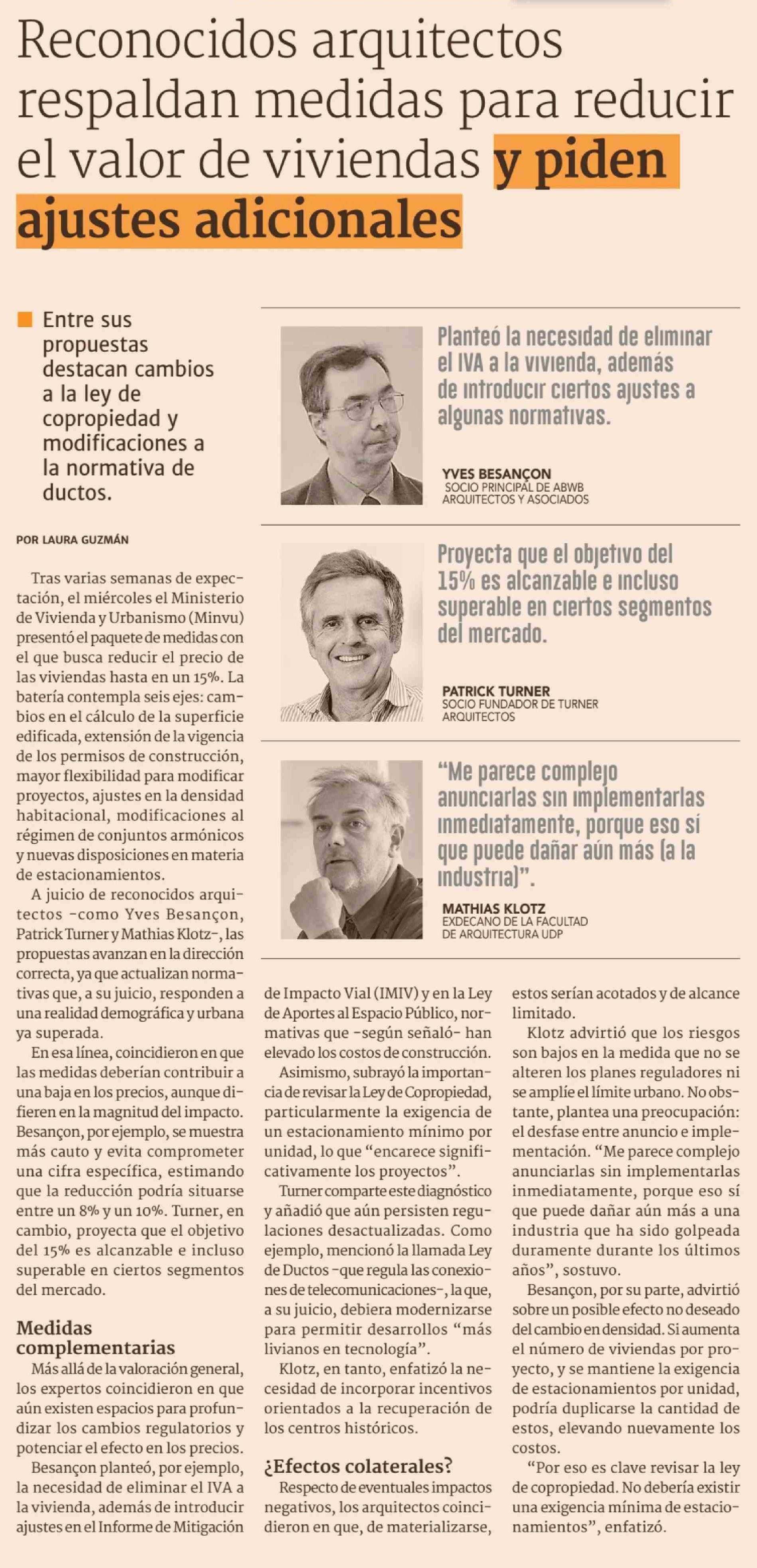 Reconocidos arquitectos respaldan medidas para reducir el valor de viviendas y piden ajustes adicionales 10-04-2026 Diario Financiero |