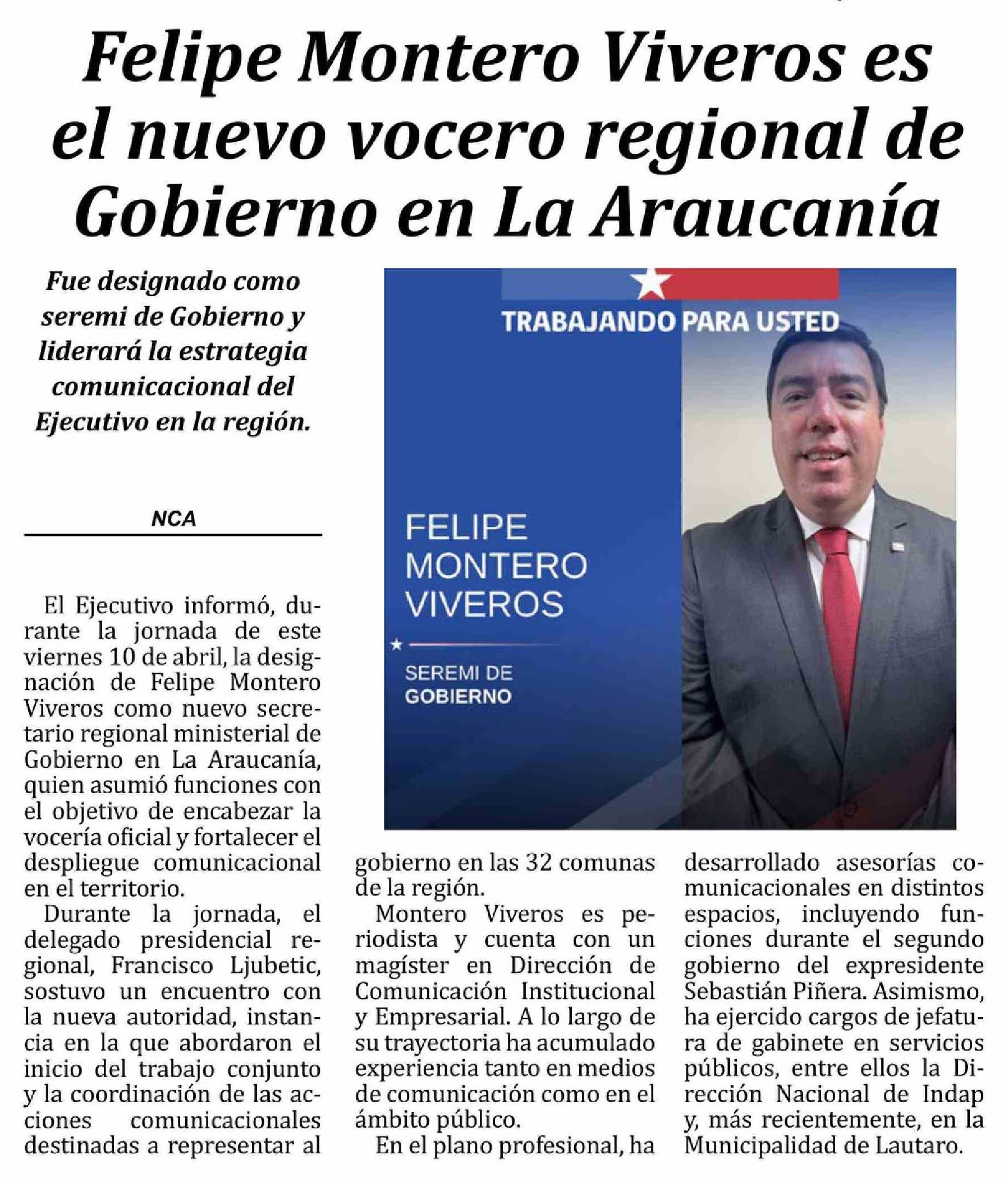 Felipe Montero Viveros es el nuevo vocero regional de Gobierno en La Araucanía 11-04-2026 Las Noticias |