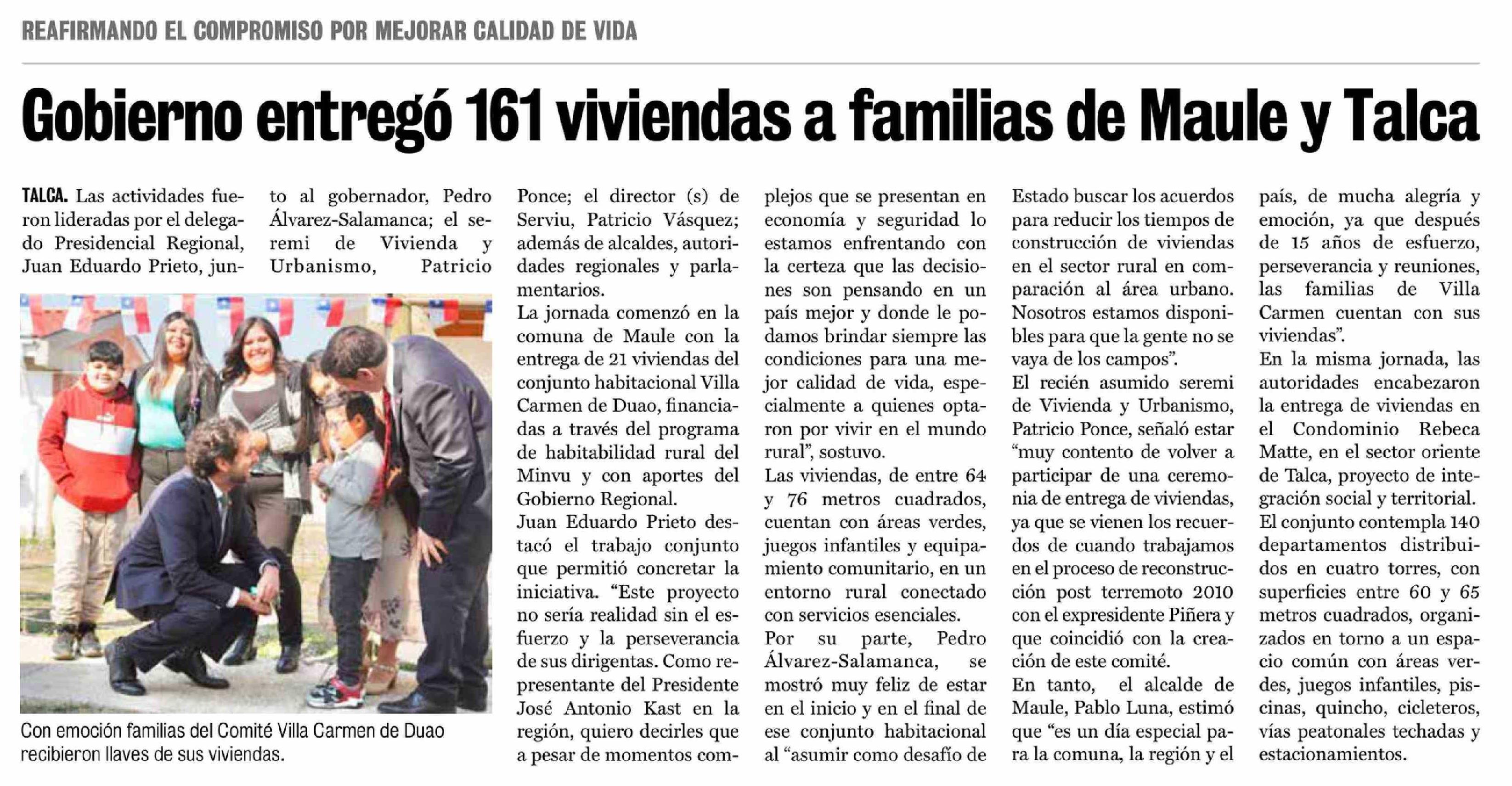 Gobierno entrego 161 viviendas a familias de Maule y Talca 30-03-2026 La Prensa de Curicó |