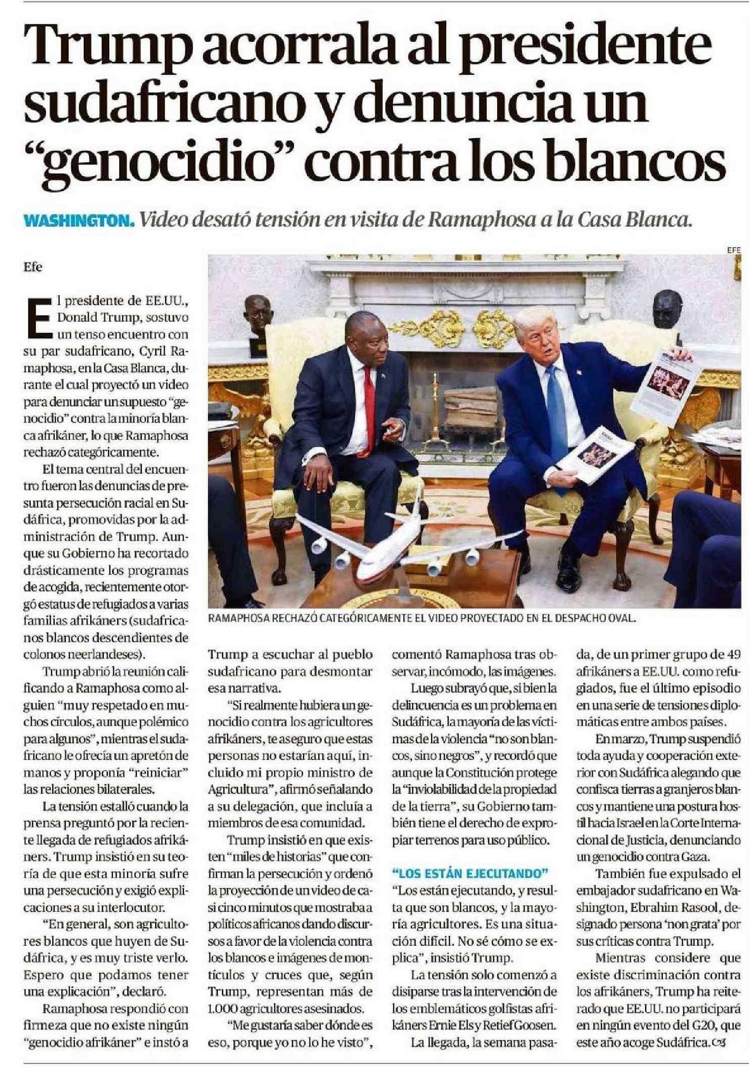 Trump acorrala al presidente sudafricano y denuncia un "genocidio" contra los blancos 22-05-2025 Diario Austral Región de Los Ríos |