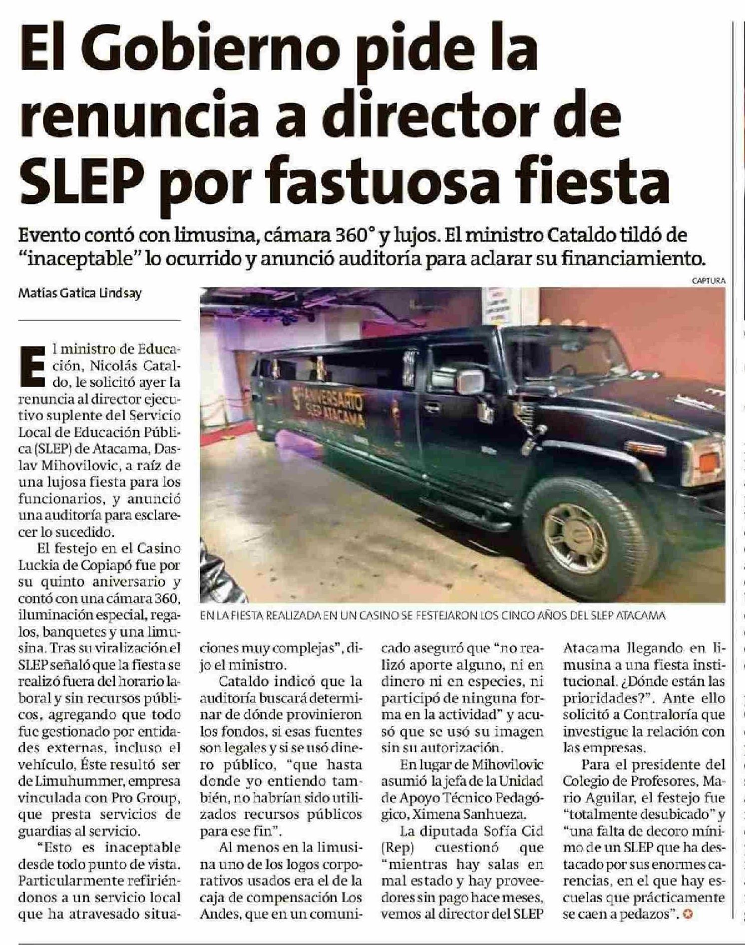 Título: El Gobierno pide la renuncia a director de SLEP por fastuosa fiesta