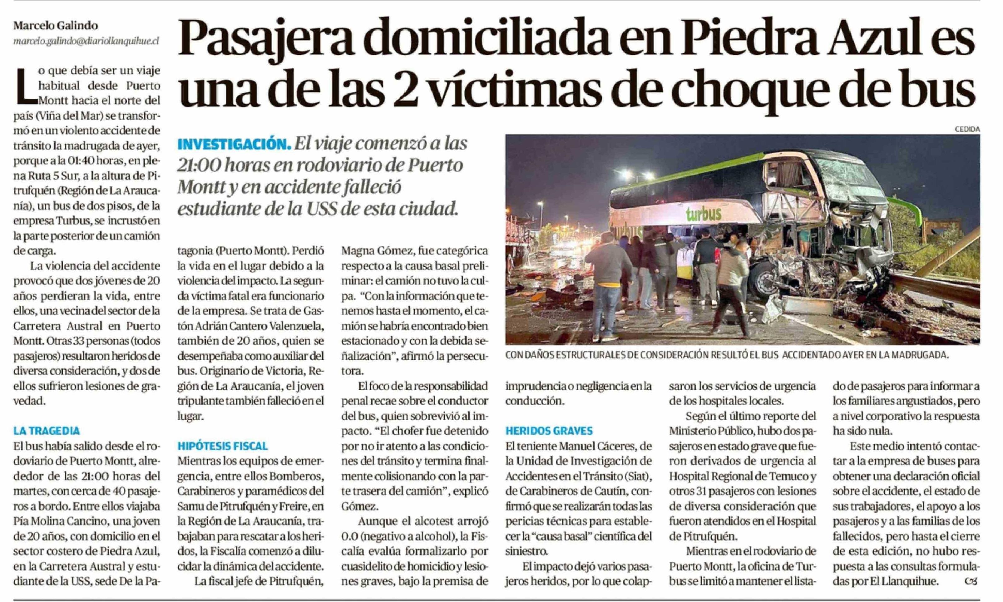 Pasajera domiciliada en Piedra Azul es una de las 2 víctimas de choque de bus 05-02-2026 El Austral de Osorno |