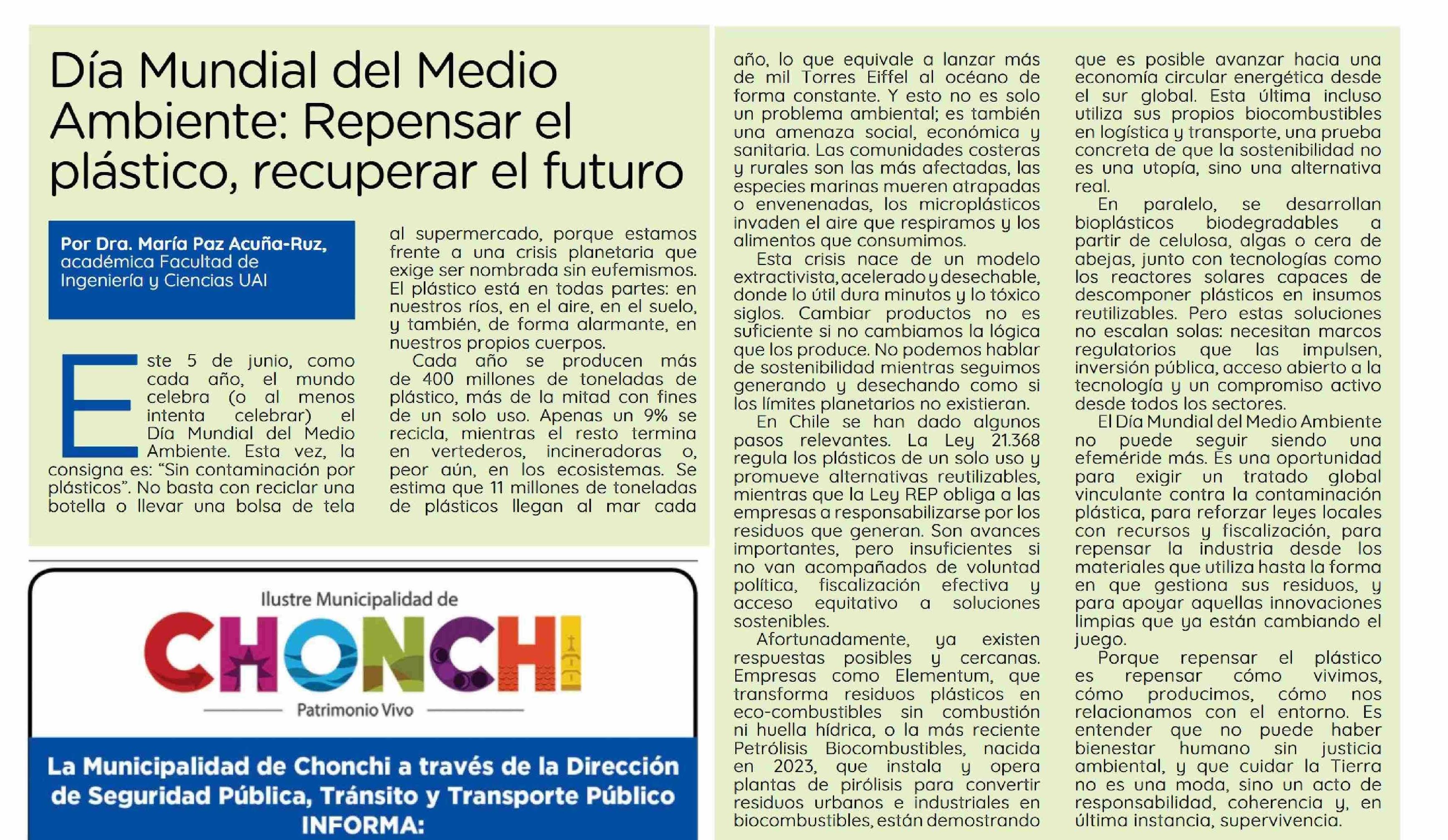 | Título: | COLUMNAS DE OPINIÓN: Día Mundial del Medio Ambiente: Repensar el plástico, recuperar el futuro |