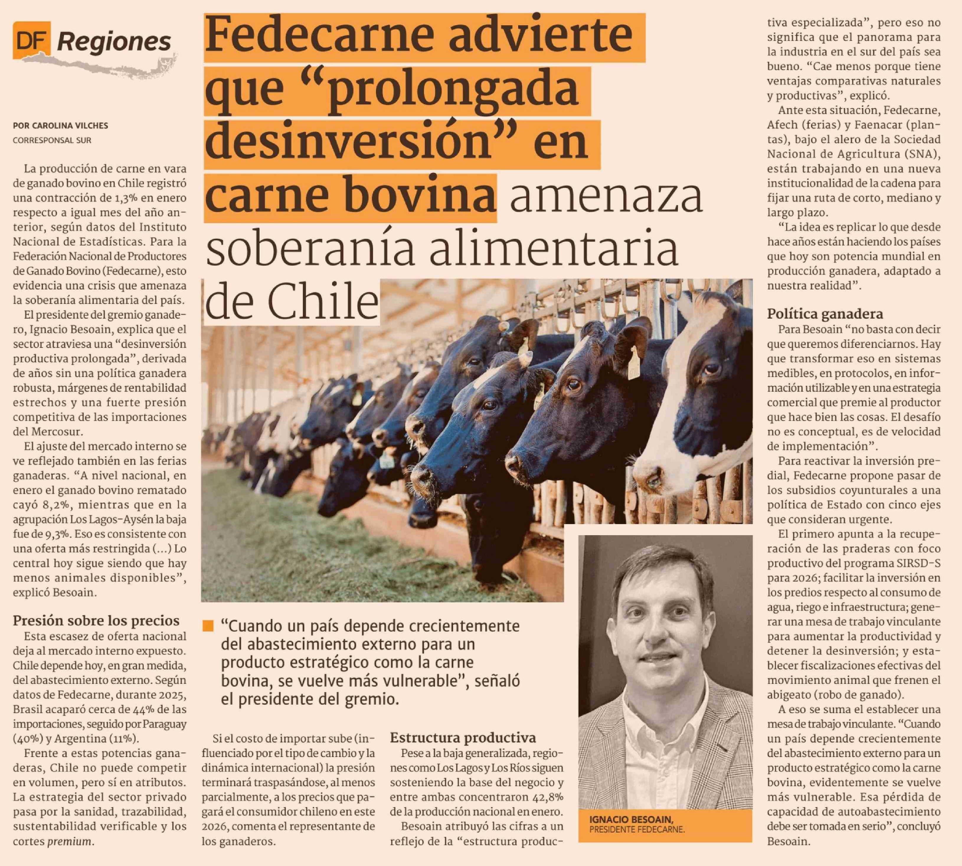 Fedecarne advierte Que "prolongada desinversión" en carne bovina amenaza soberanía alimentaria de Chile 12-03-2026 Diario Financiero |