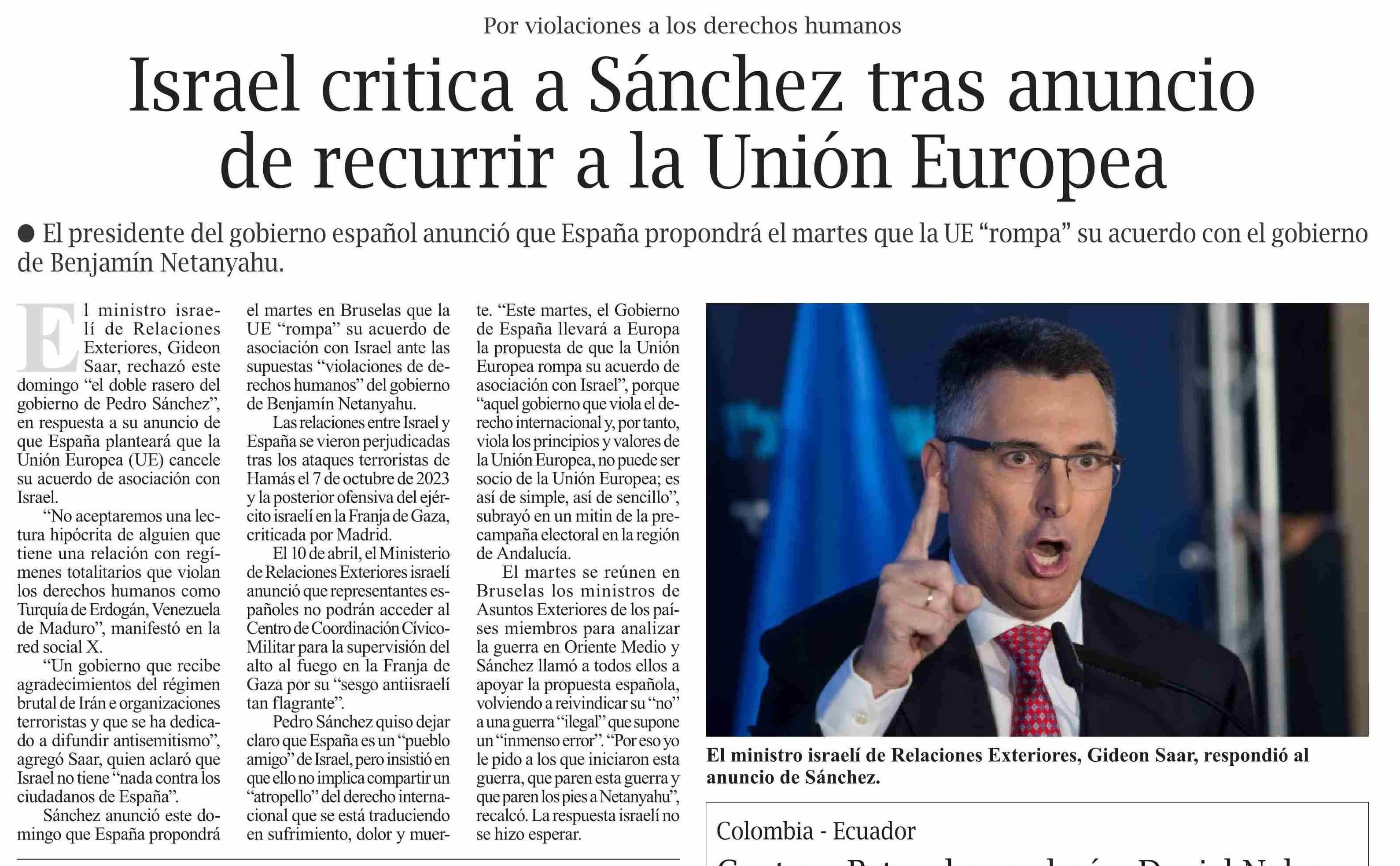 | Título: | Israel critica a Sánchez tras anuncio de recurrir a la Unión Europea |