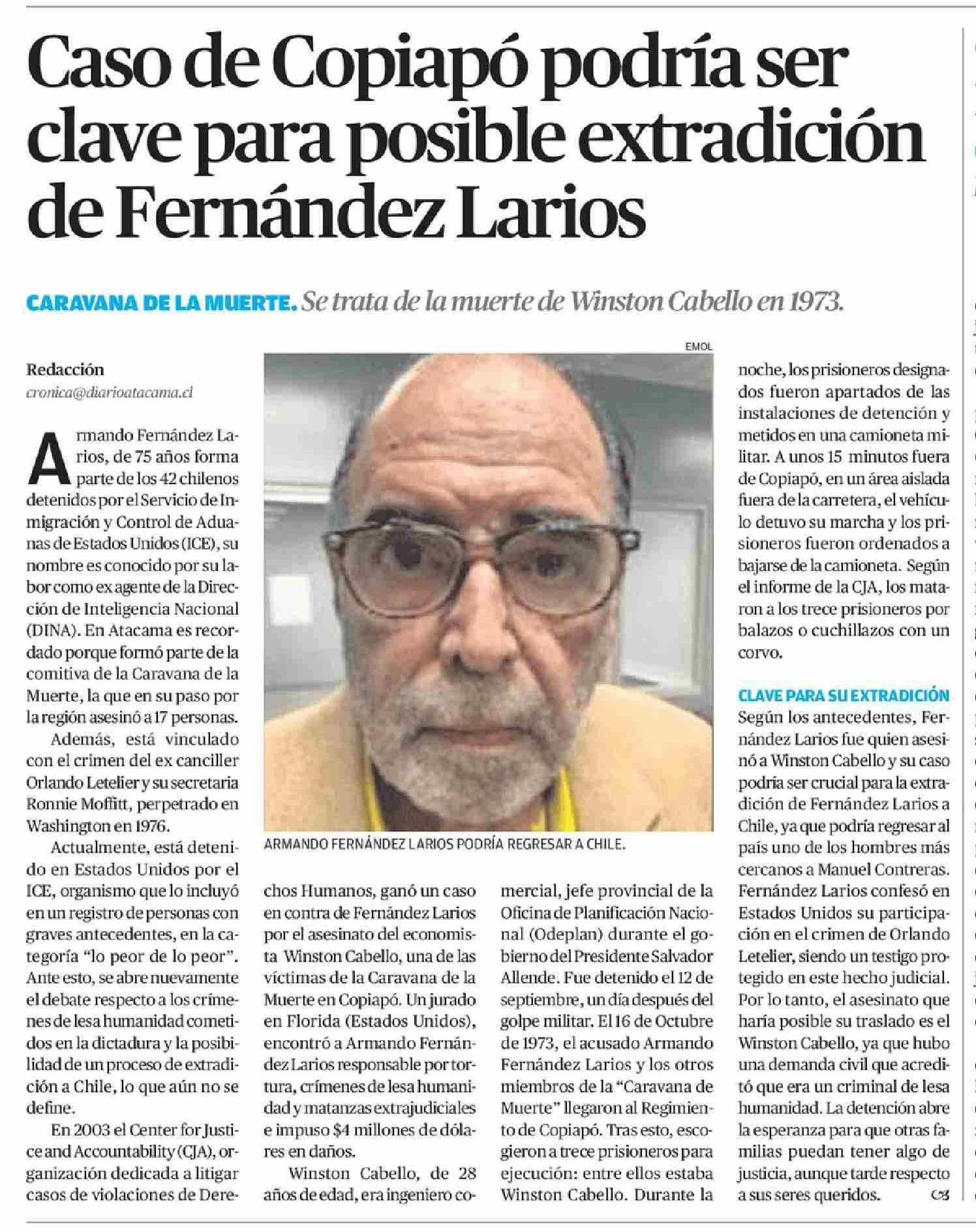 Caso de Copiapó podría ser clave para posible extradición de Fernández Larios 06-02-2026 El Diario de Atacama |