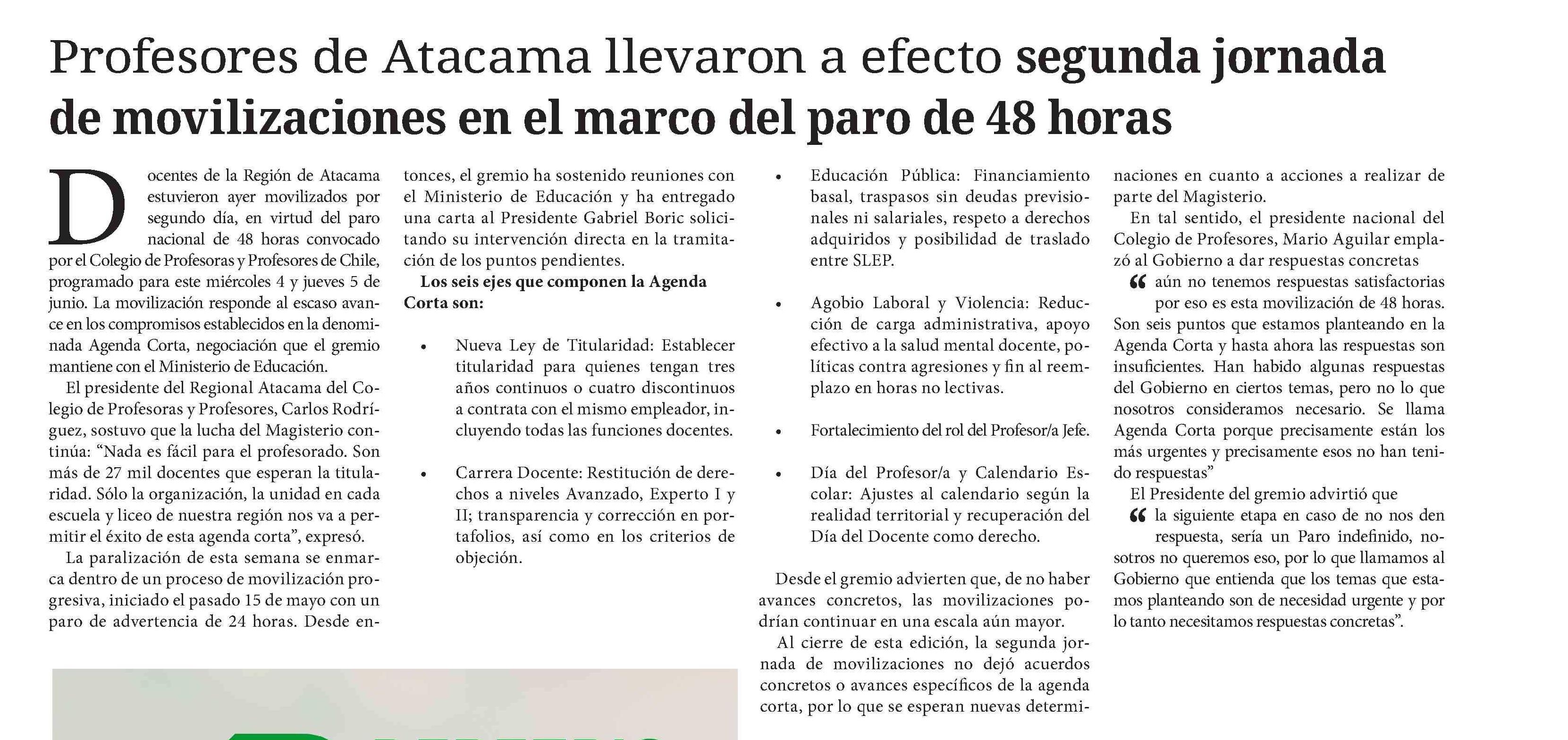 Profesores de Atacama llevaron a efecto segunda jornada de movilizaciones en el marco del paro de 48 horas 06-06-2025 Diario Chañarcillo |