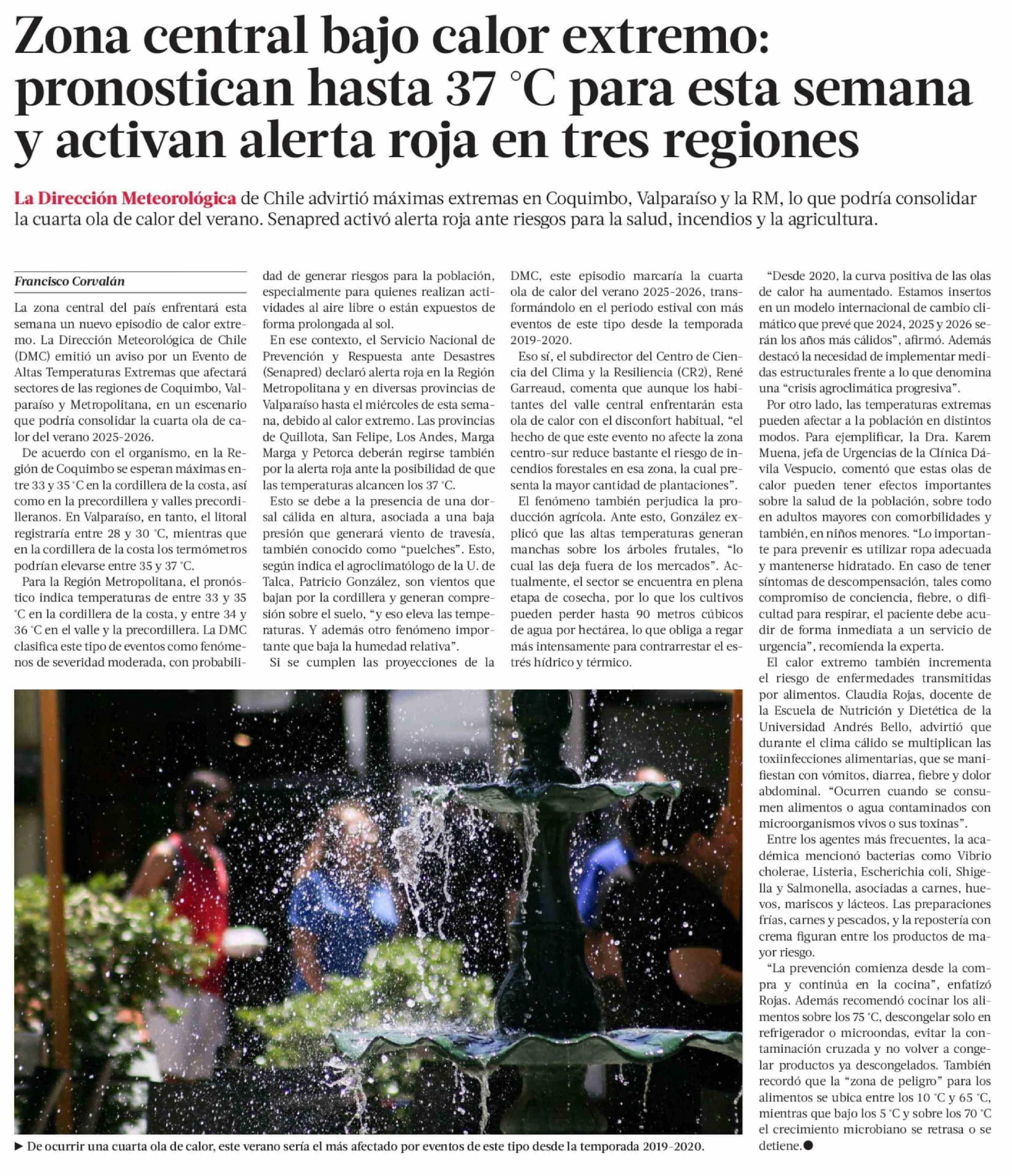 Zona central bajo calor extremo: pronostican hasta 37 ? para esta semana y activan alerta roja en tres regiones 17-02-2026 La Tercera |