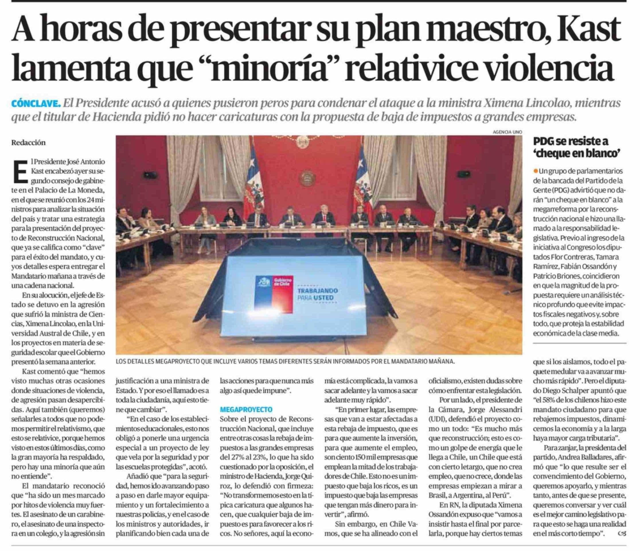 Título: A horas de presentar su plan maestro, Kast lamenta que "minoría" relativice violencia