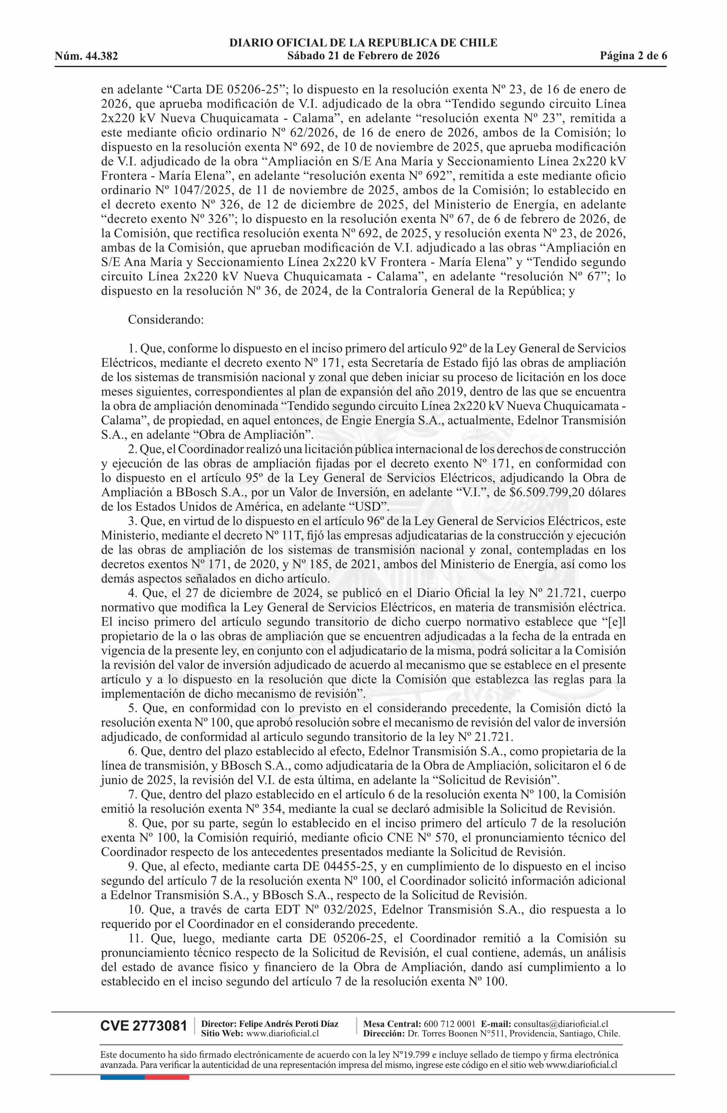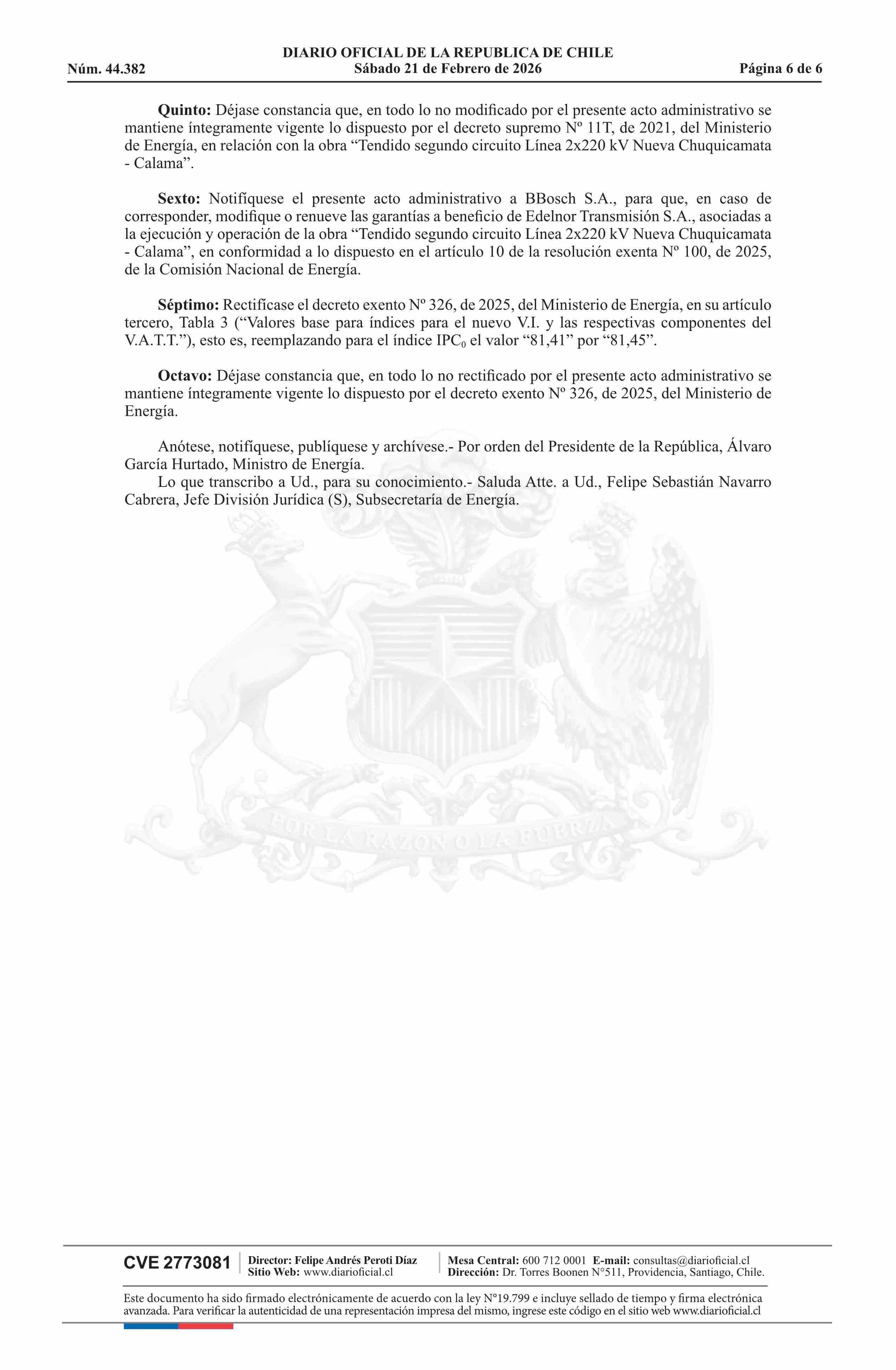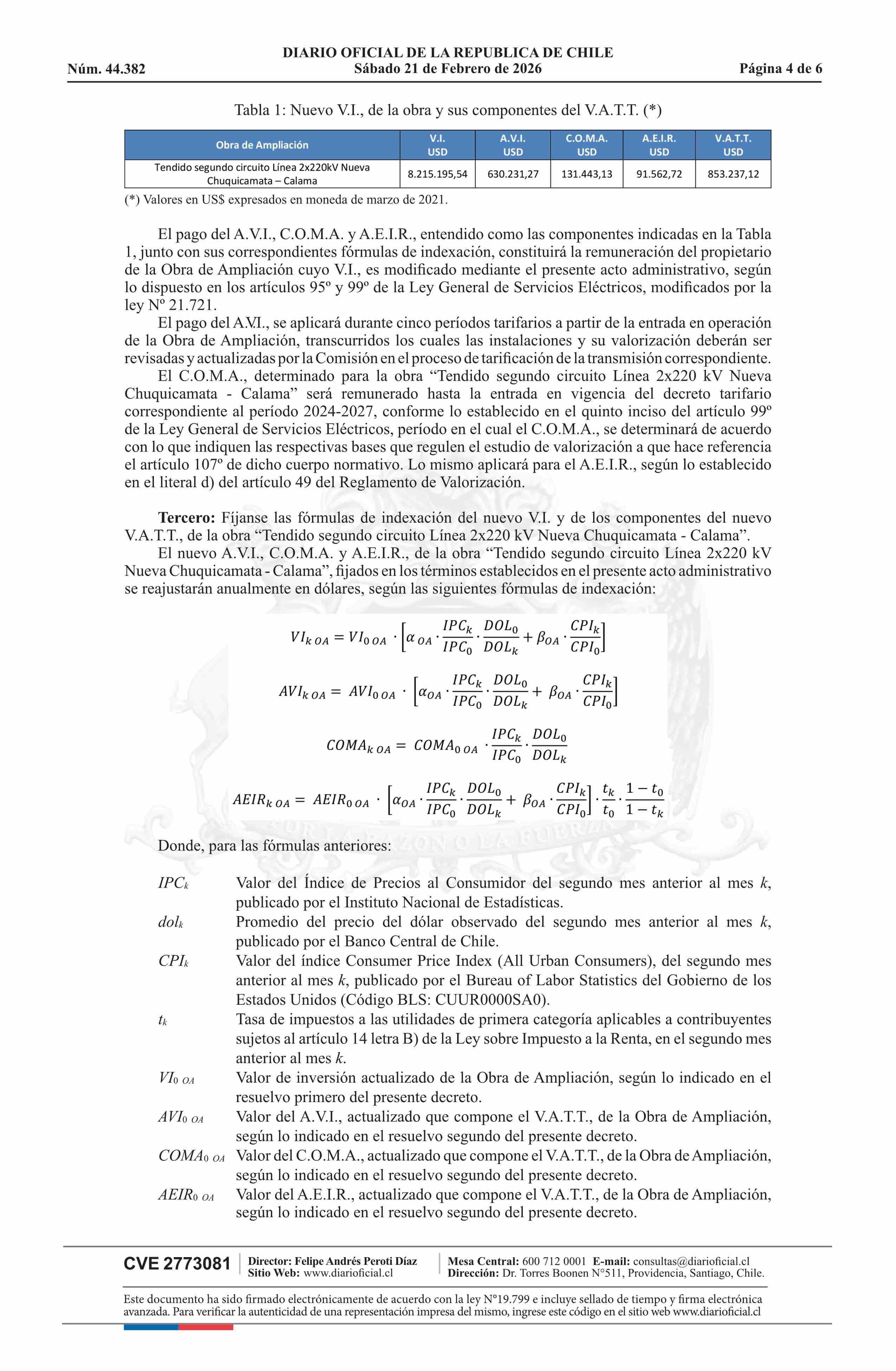| Título: | Decreto exento número 53, de 2026.- Fija nuevo valor de inversión y valores de las componentes del nuevo valor anual de la transmisión por tramo de la obra Tendido Segundo Circuito Línea 2x220 kV Nueva Chuquicamata - Calama, sus fórmulas de indexación y actualiza cronograma de ejecución, y rectifica |