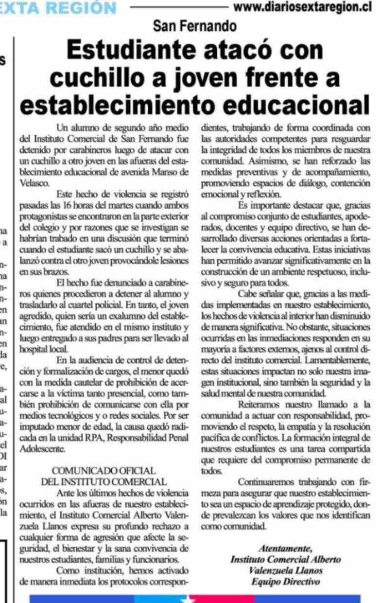 Título: Estudiante atacó con cuchillo a joven frente a establecimiento educacional