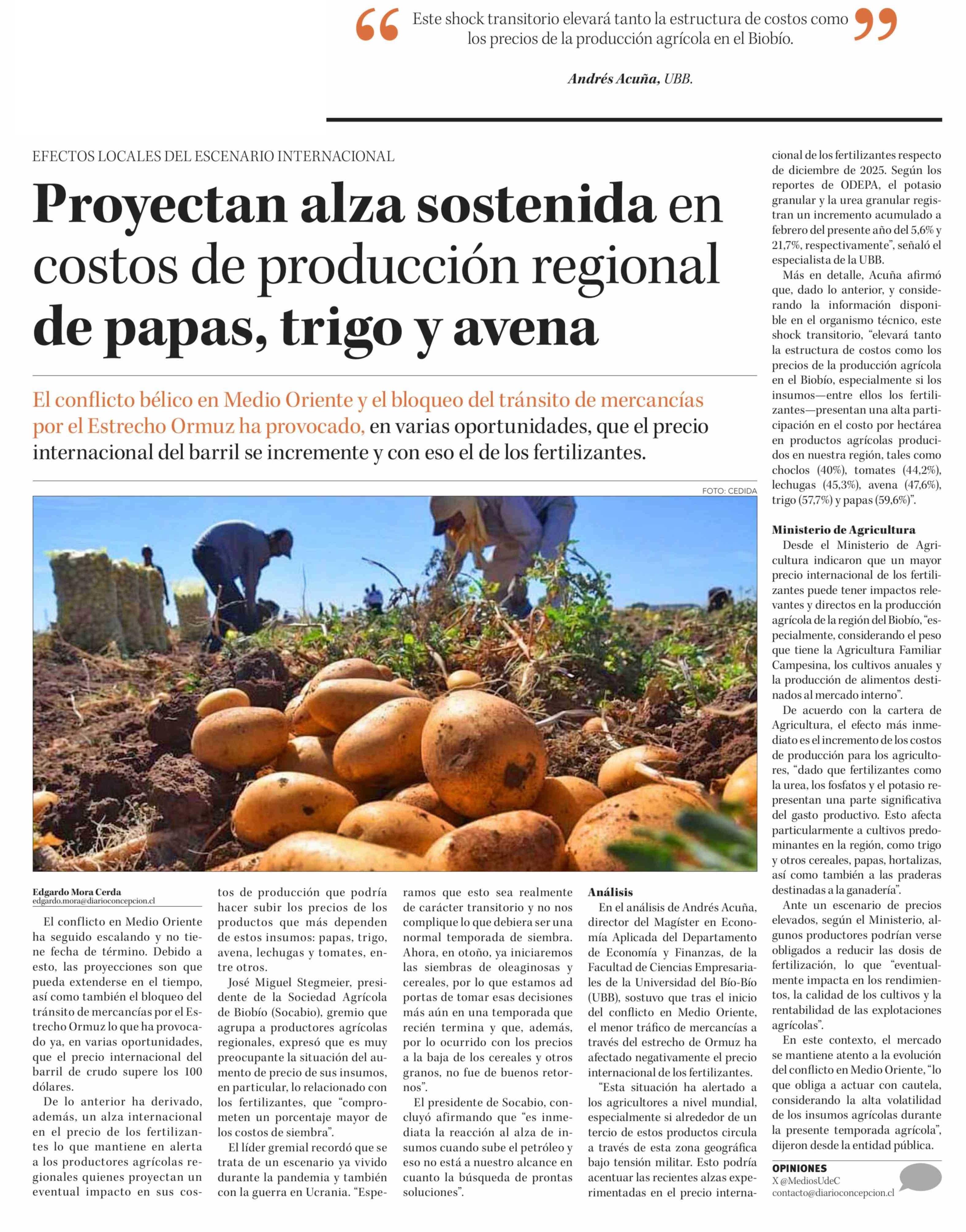 Proyectan alza sostenida en costos de producción regional de papas, trigo y avena 24-03-2026 Diario Concepción |