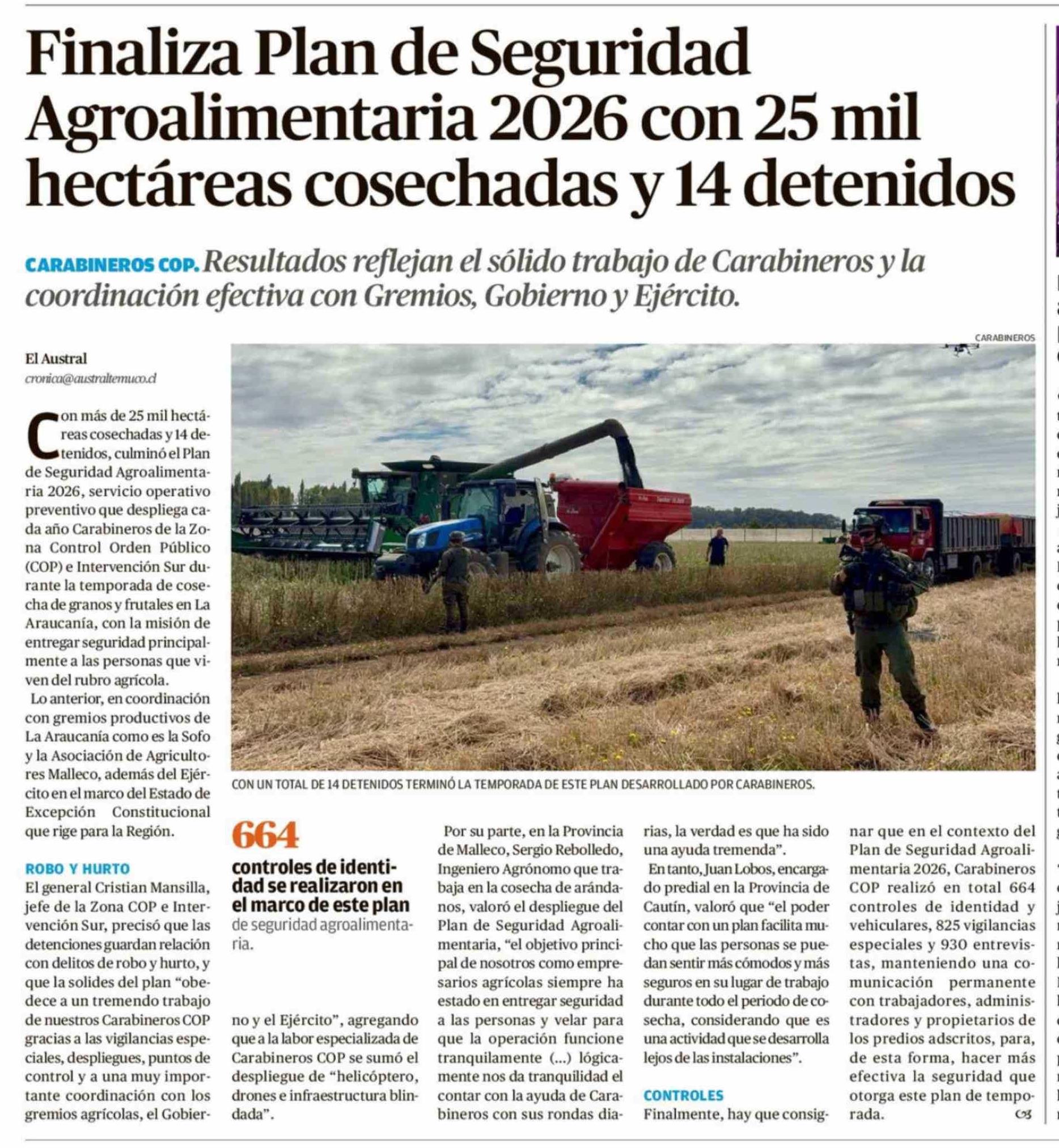 Finaliza Plan de Seguridad Agroalimentaria 2026 con 25 mil hectáreas cosechadas y 14 detenidos 08-03-2026 El Austral de la Araucanía |