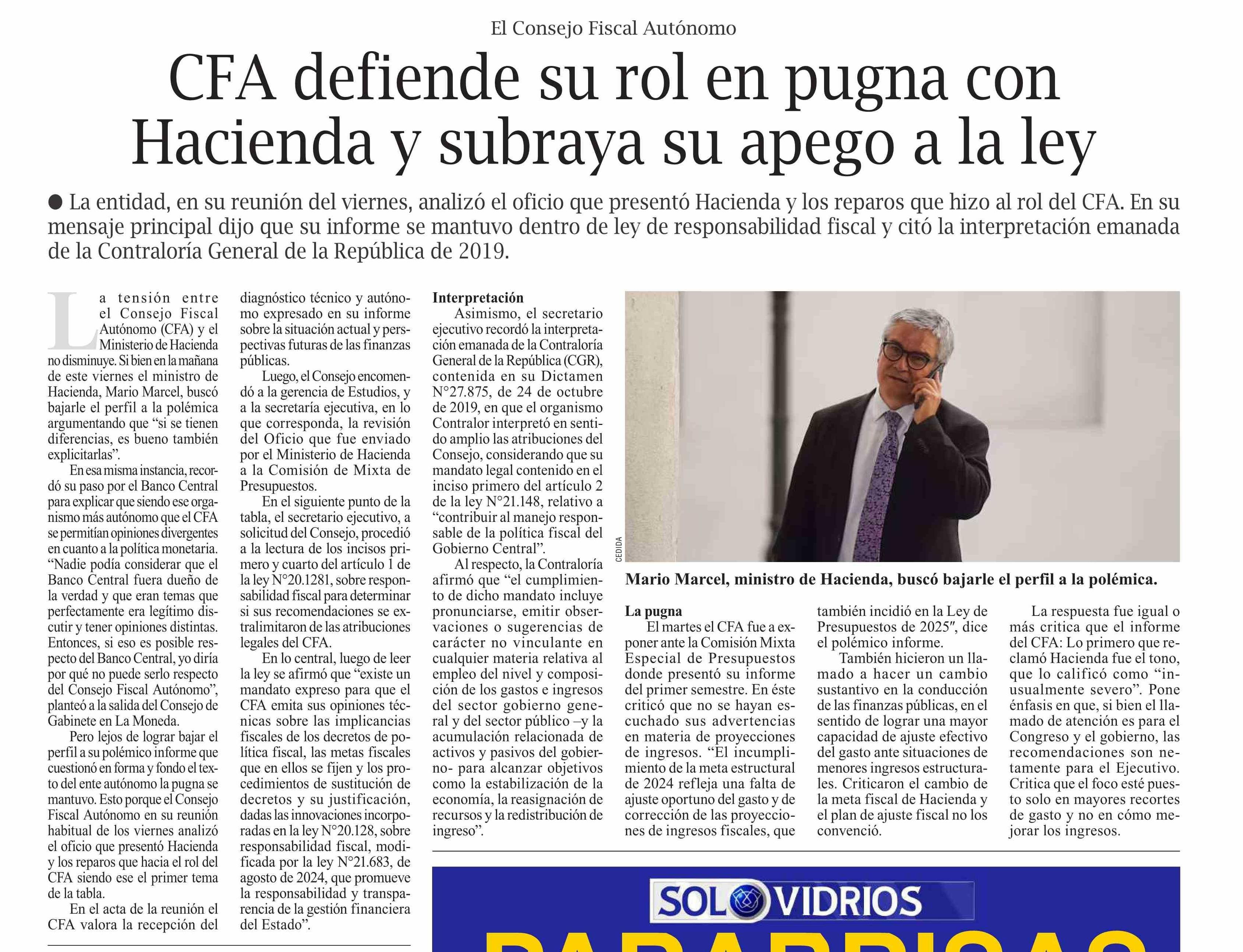 | Título: | CFA defiende su rol en pugna con Hacienda y subraya su apego a la ley |