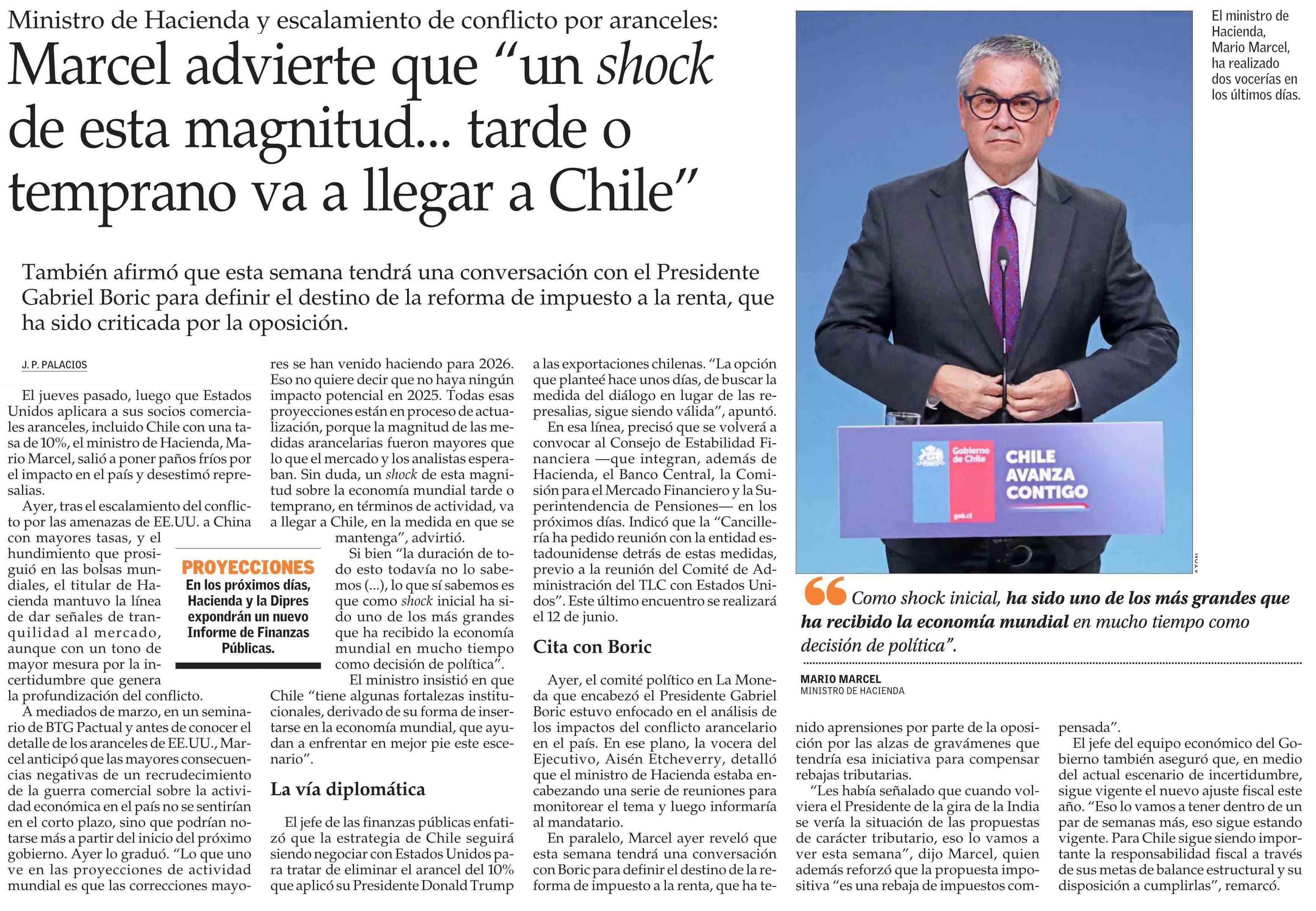 Marcel advierte que “un shock de esta magnitud.. . tarde o temprano va a llegar a Chile” 08-04-2025 El Mercurio |