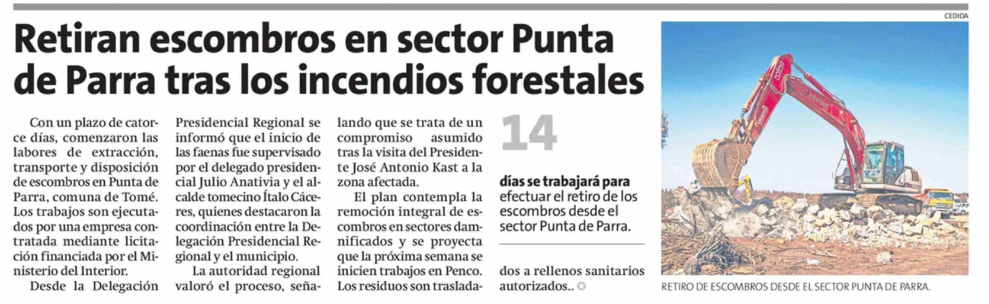 Retiran escombros en sector Punta de Parra tras los incendios forestales 25-03-2026 La Estrella de Concepción |