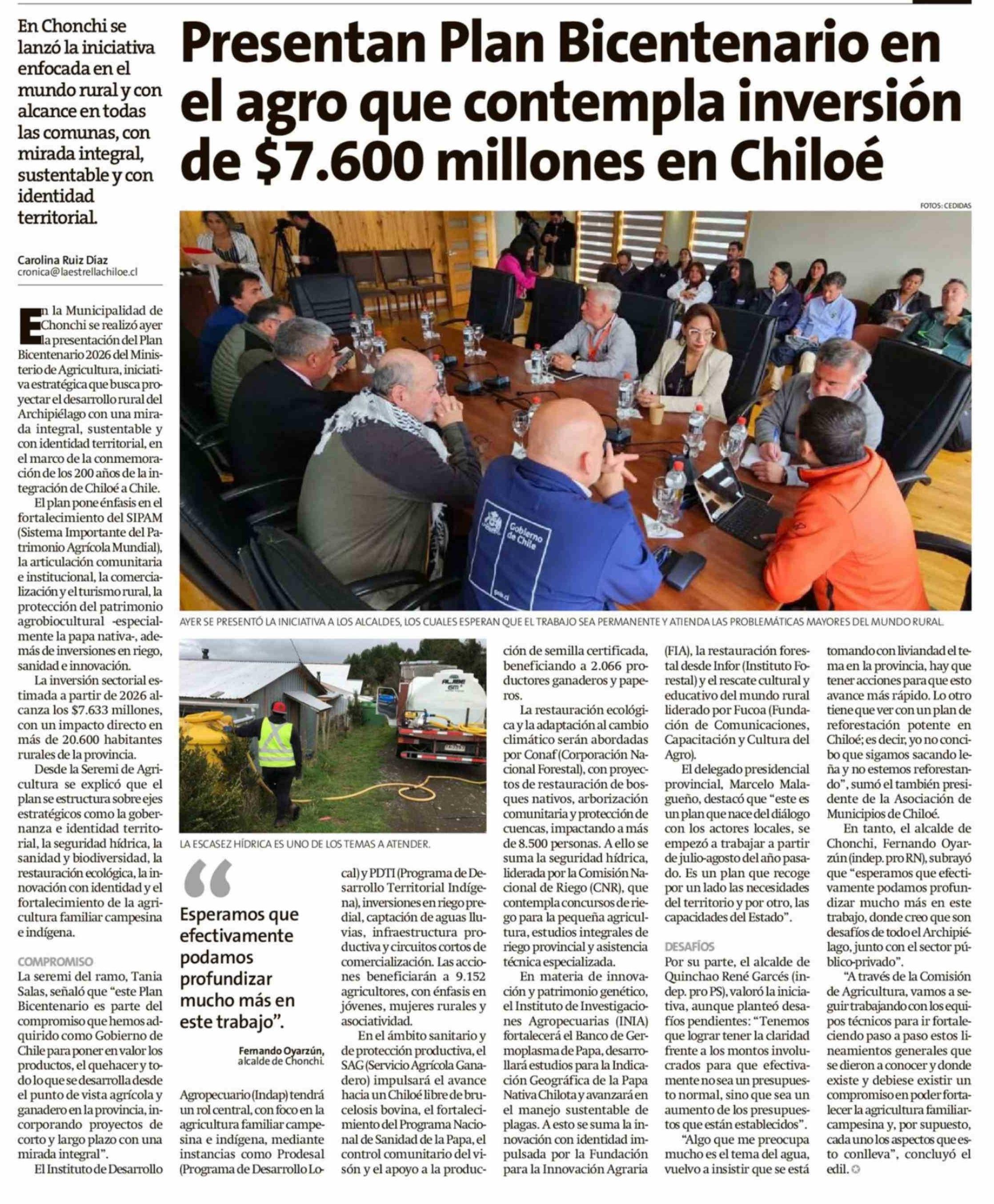 Presentan Plan Bicentenario en el agro que contempla inversión de $7.600 millones en Chiloé 14-02-2026 La Estrella de Chiloé |