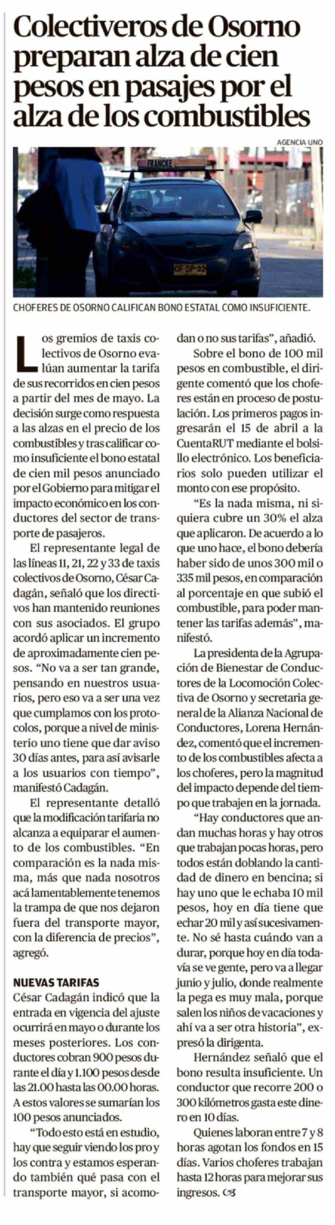 Colectiveros de Osorno preparan alza de cien pesos en pasajes por el alza de los combustibles 11-04-2026 El Llanquihue |