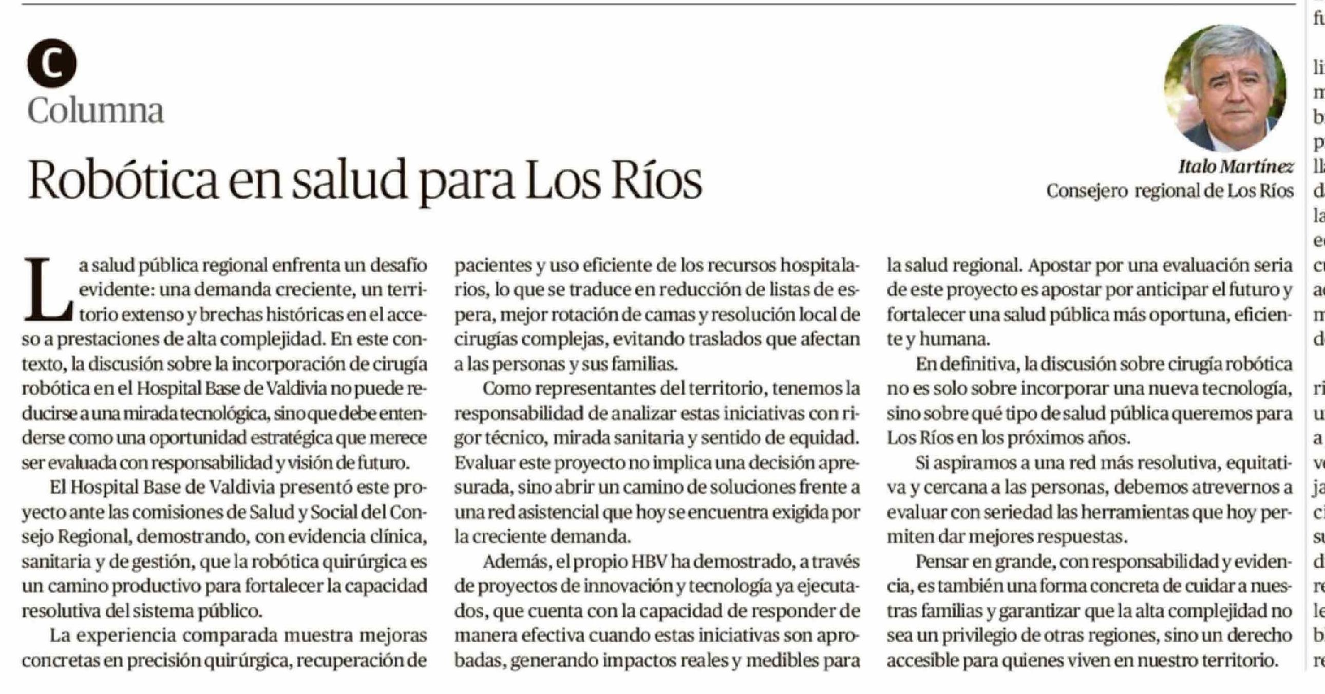 Columnas de Opinión: Robótica en salud para Los Ríos 12-02-2026 Diario Austral Región de Los Ríos |