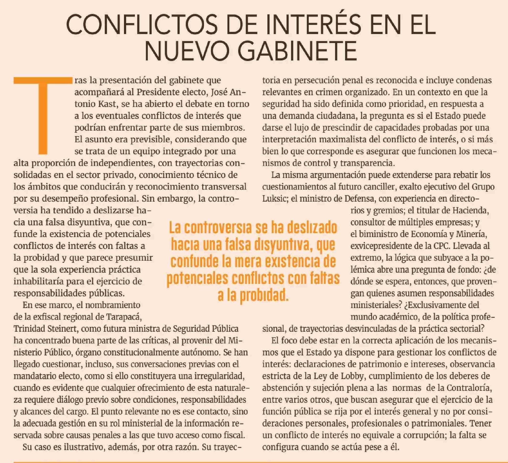 Título: Editorial: CONFLICTOS DE INTERÉS EN EL NUEVO GABINETE