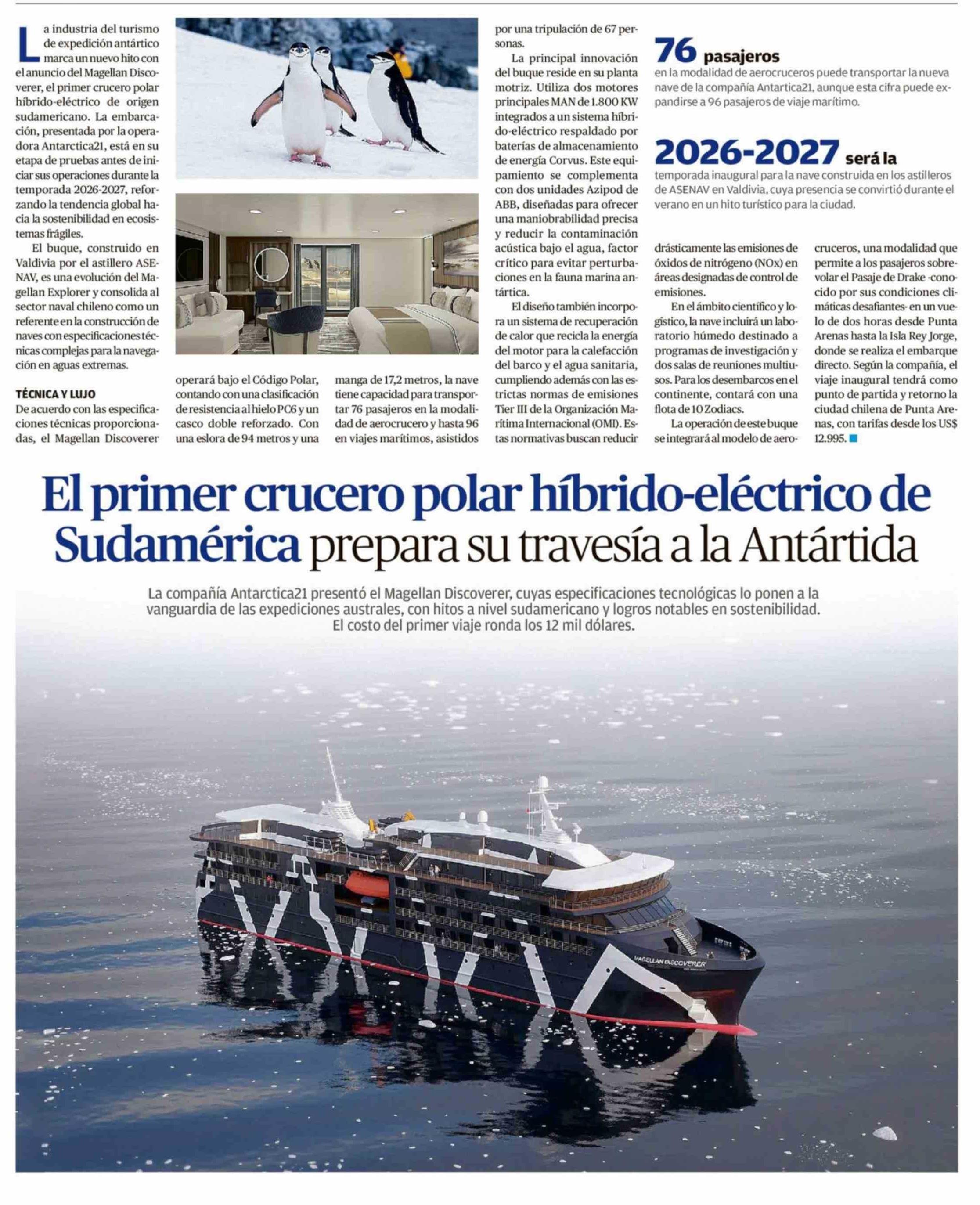 El primer crucero polar híbrido-eléctrico de Sudamérica prepara su travesía a la Antártida 22-02-2026 El Mercurio de Valparaíso |