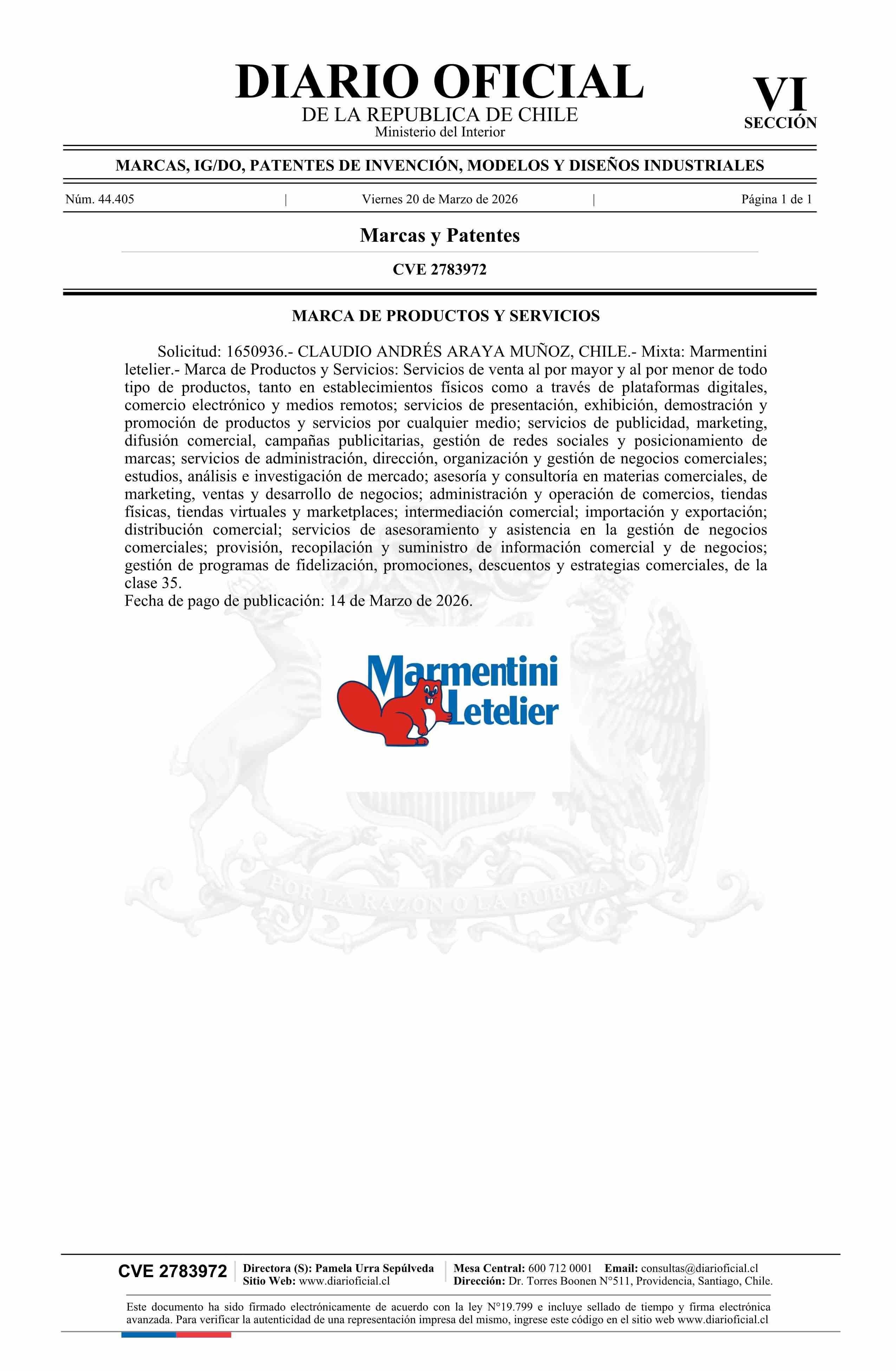 Solicitud número 1650936.- Marmentini letelier 20-03-2026 Diario Oficial Edición Electrónica |
