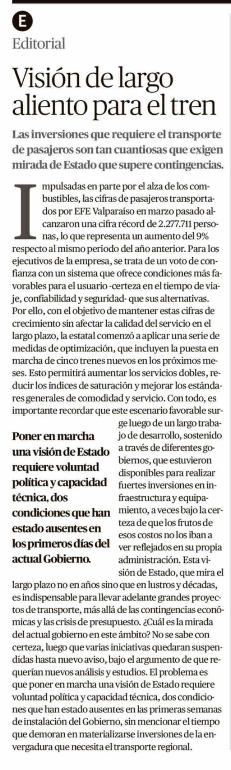 Editorial: Visión de largo aliento para el tren 07-04-2026 El Mercurio de Valparaíso |