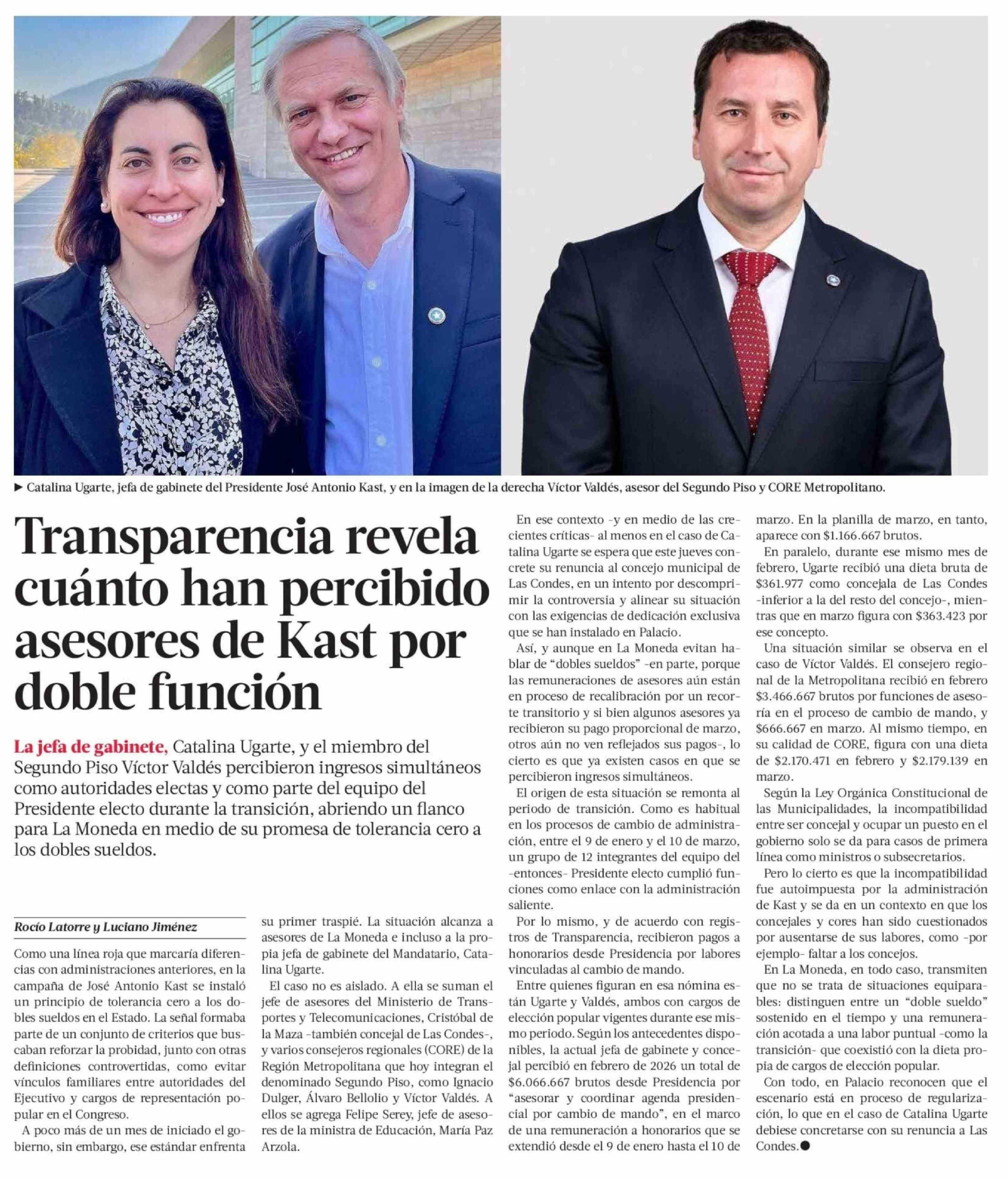 Transparencia revela cuánto han percibido asesores de Kast por doble función 16-04-2026 La Tercera |