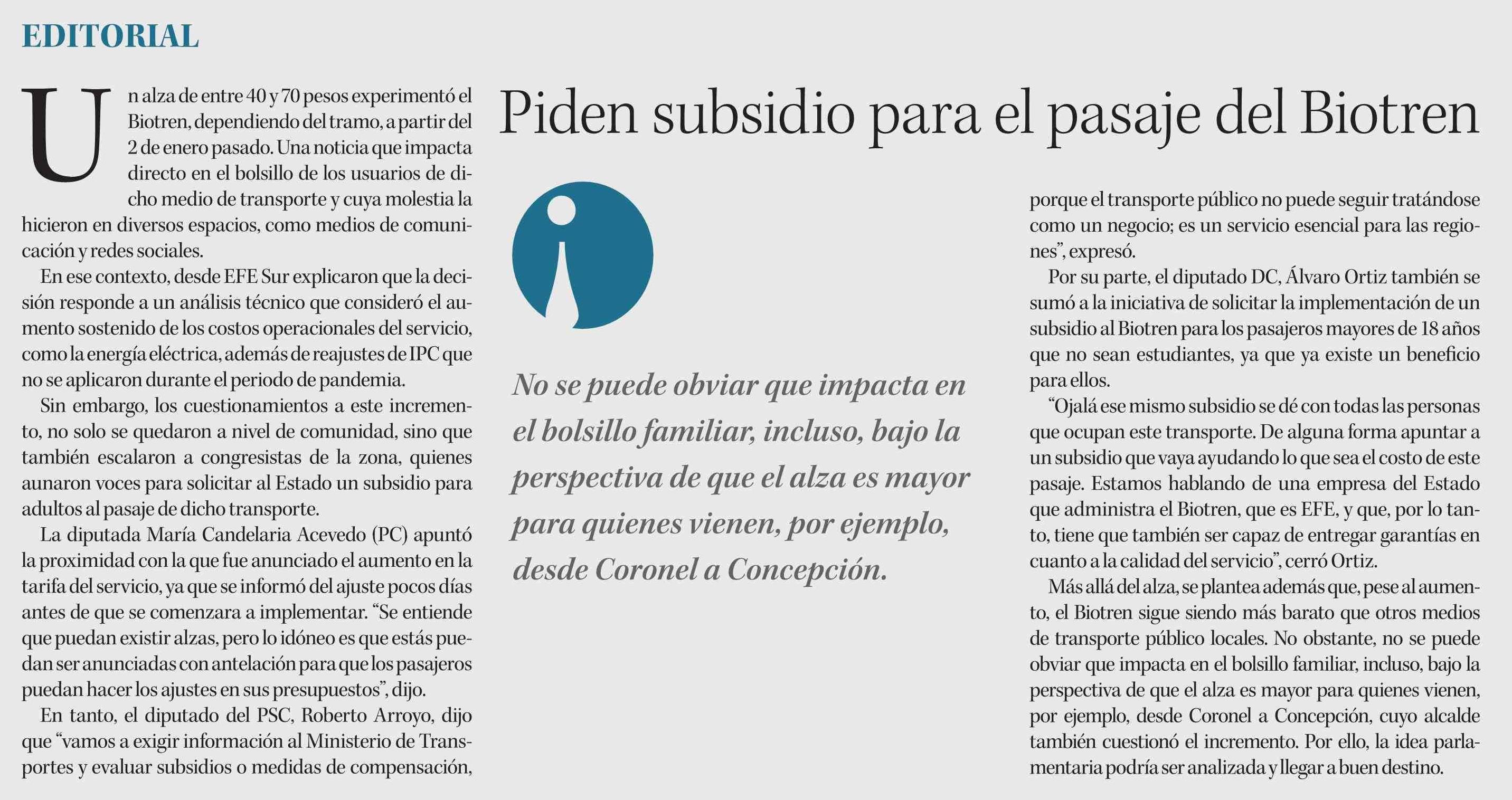 Título: Editorial: Piden subsidio para el pasaje del Biotren
