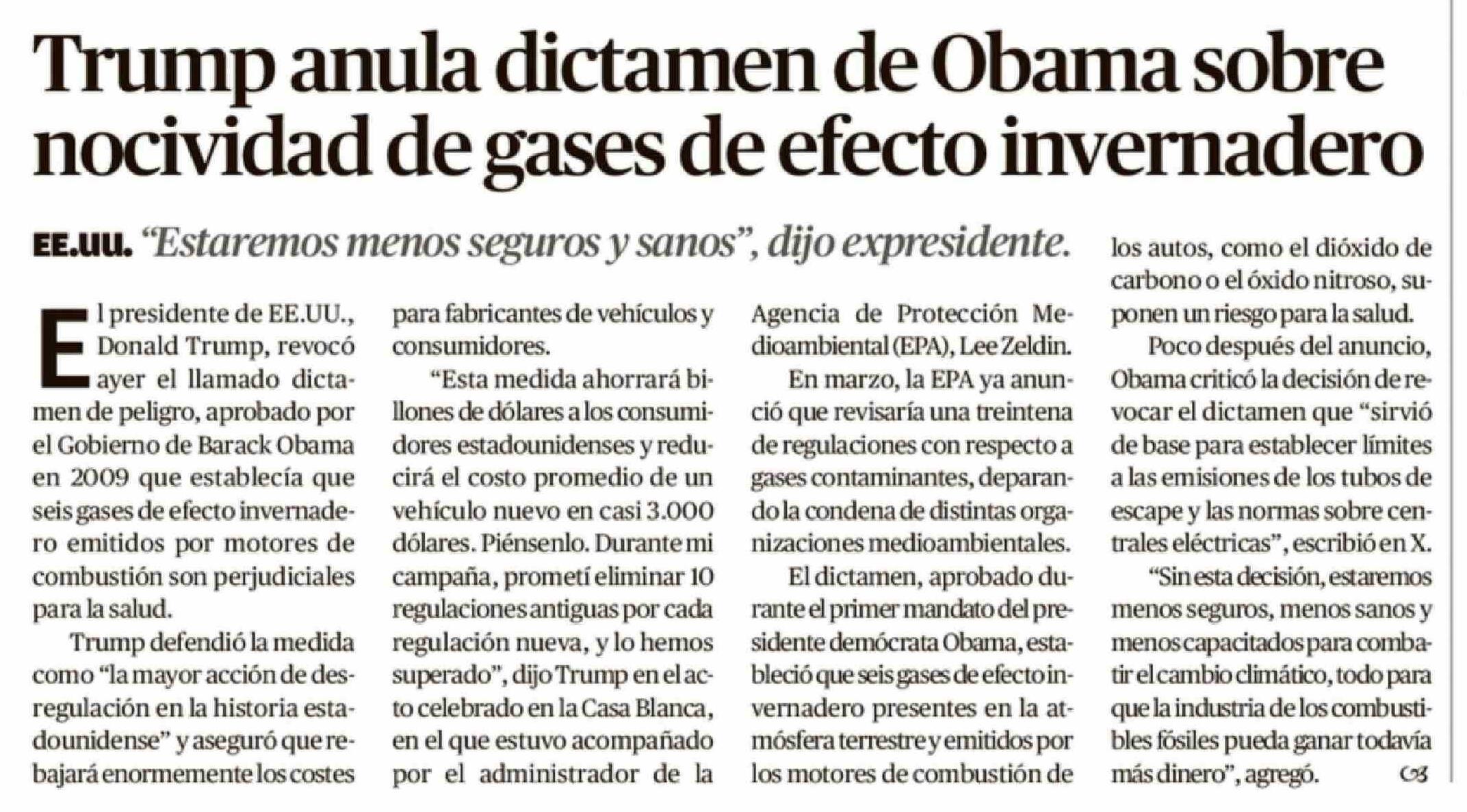 Trump anula dictamen de Obama sobre nocividad de gases de efecto invernadero 13-02-2026 El Austral de Osorno |