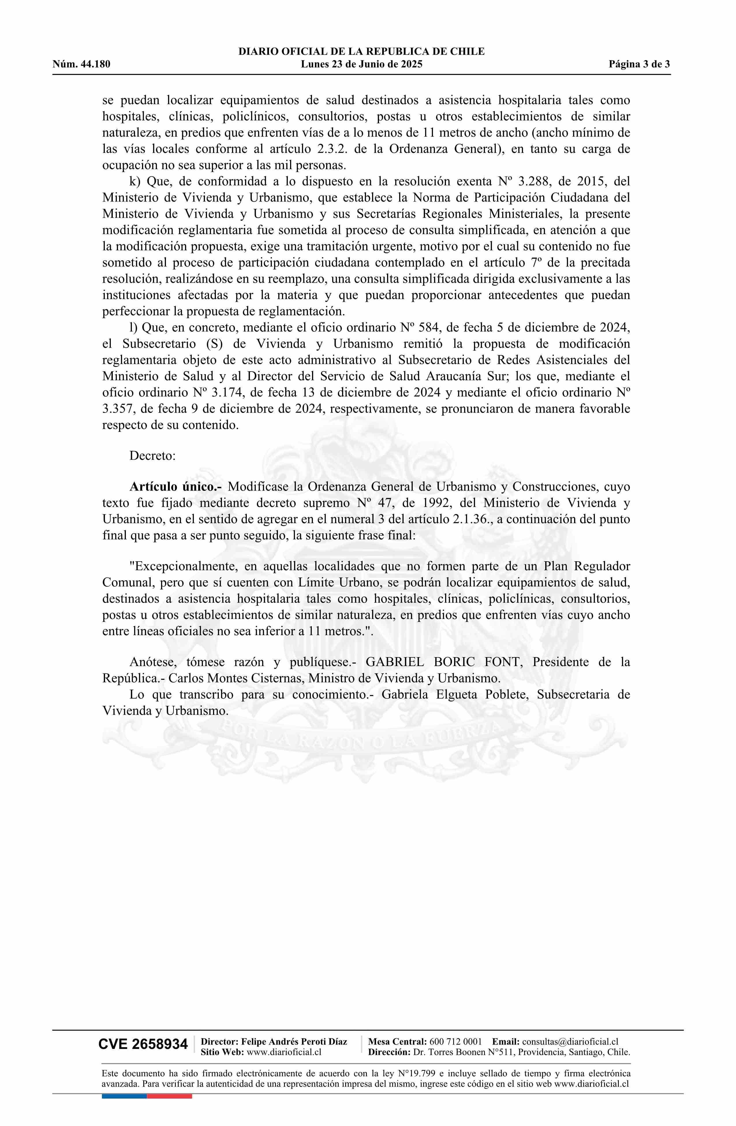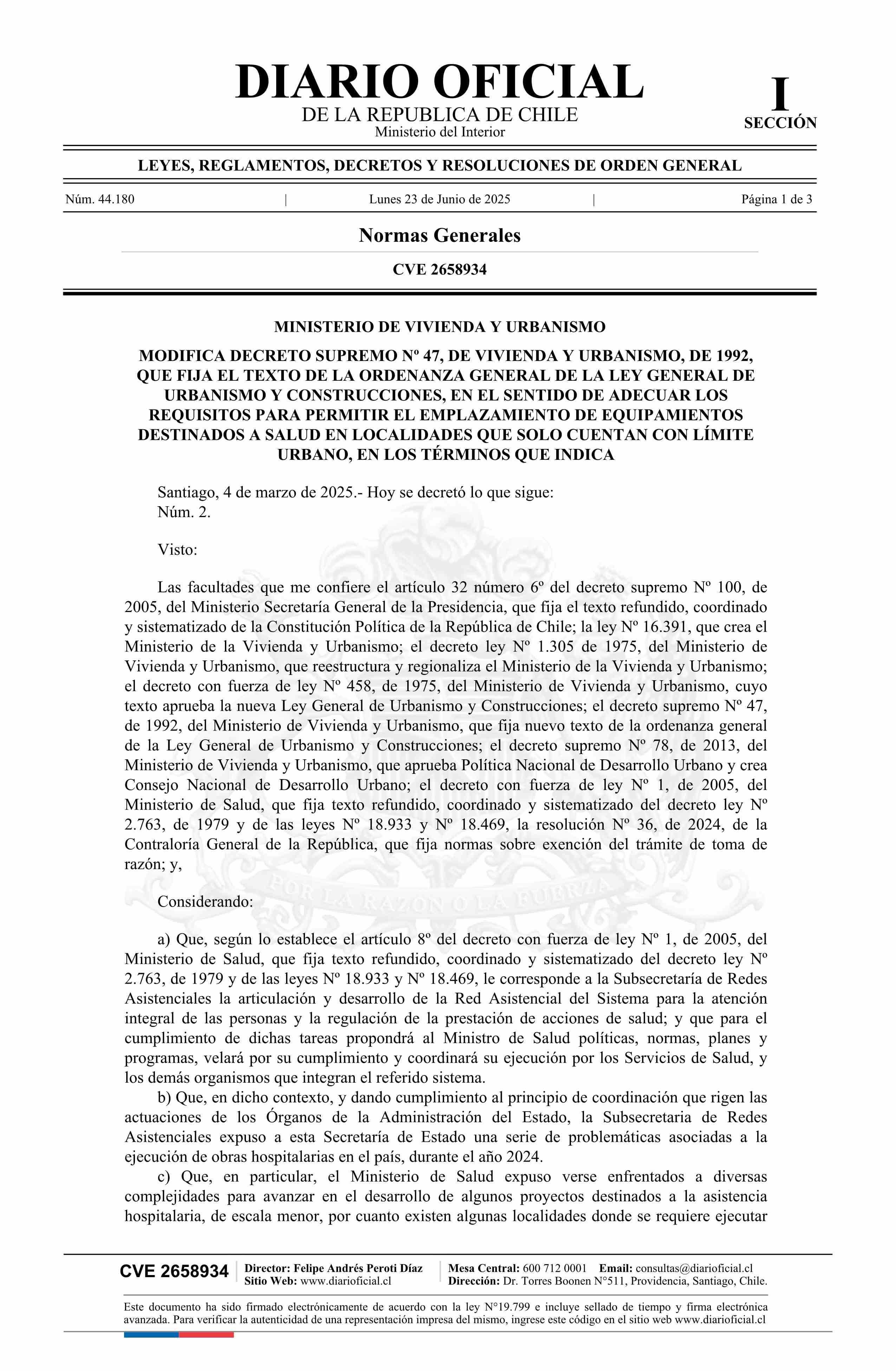 | Título: | Decreto número 2, de 2025.- Modifica decreto Nº 47, de 1992, que fija el texto de la Ordenanza General de la Ley General de Urbanismo y Construcciones, en el sentido de adecuar los requisitos para permitir el emplazamiento de equipamientos destinados a salud en localidades que solo cuentan con límit |