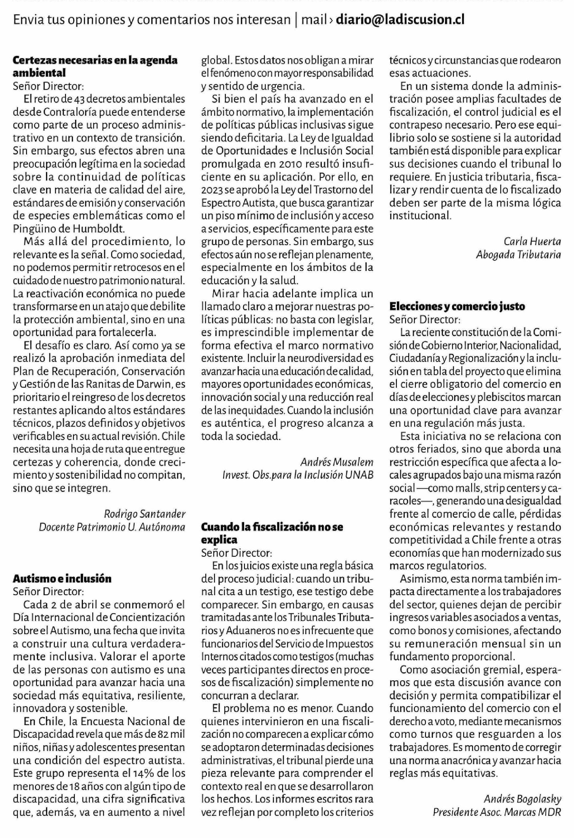 Título: Certezas necesarias en la agenda ambiental Señor Director: El retiro de 43 decretos ambientales desde Contraloría puede entenderse como parte de un proceso administrativo en un contexto de transición. Sin embargo, sus efectos abren una preocupación legítima en la sociedad sobre la continuidad de pol