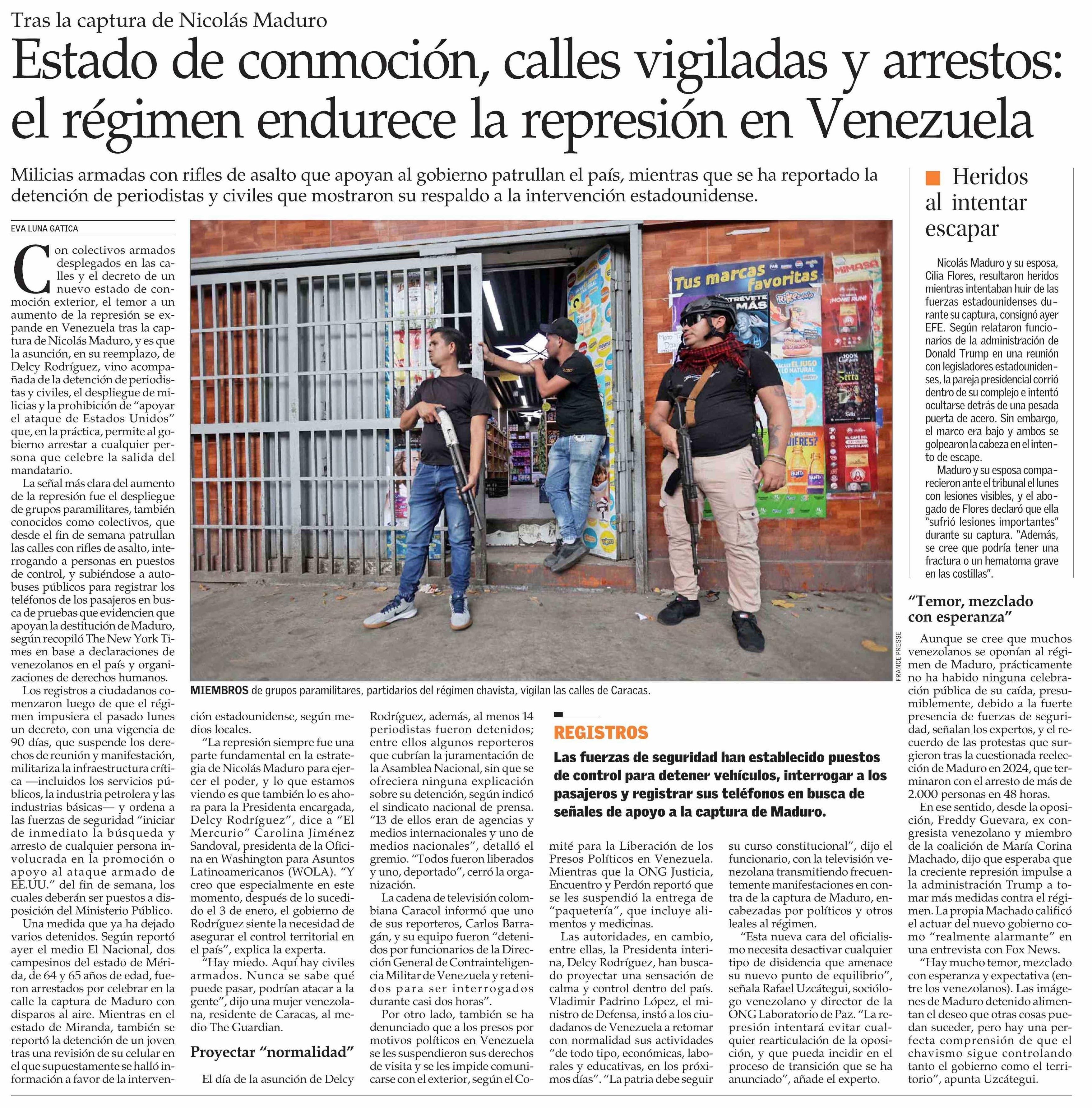 Estado de conmoción, calles vigiladas y arrestos: el régimen endurece la represión en Venezuela 08-01-2026 El Mercurio |